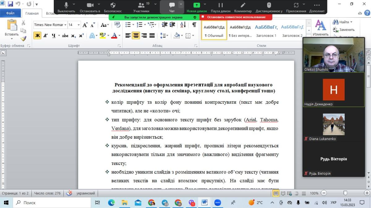 Професорка Надія Демиденко також запропонувала свою авторську розробку щодо оформлення презентації для апробації наукового дослідження (виступу на семінар, круглому столі, конференції тощо). Нею також, для прикладу та обговорення, було представлено зразки раніше опублікованих тез студентів.