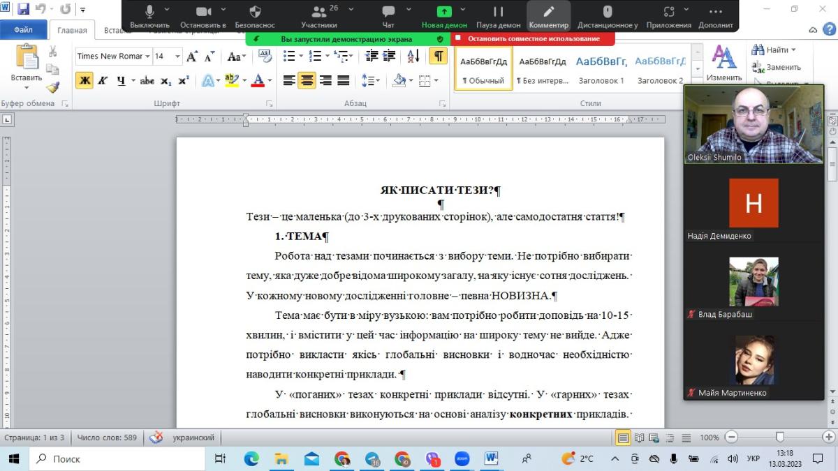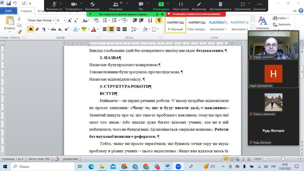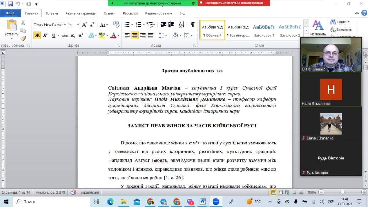 На засідання гуртка була запрошена професорка кафедри гуманітарних дисциплін Сумської філії ХНУВС Надія Демиденко. Вона провела бесіду зі студентами на тему «Як писати тези наукової доповіді?». Членам гуртка було надано дієві рекомендації щодо вибору теми дослідження, назви та обов’язковості наукової новизни в ньому. Щодо структури тез, детально проаналізували вступ, основну частину та висновок. Особливо було наголошено на правилах оформлення наукової роботи та посиланнях використаних джерел.