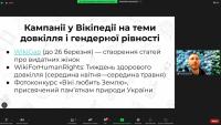 Також Антон Процюк, координатор програм ГО «Вікімедіа Україна», розповів про проєкти громадської організації та міжнародного вікіруху з тематики довкілля та гендерної рівності. Він запропонував долучитися до написання або редагування статей Вікіпедії в рамках марафону WikiGap 2023. Основною метою щорічного марафону є висвітлення досягненнь і внесків видатних жінок-науковиць, державних діячок, захисниць України та інших і зменшення гендерного дисбалансу статей Вікіпедії (статей про жінок приблизно 18% від загально кількості).