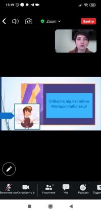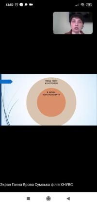 Студенти мали можливість задати питання психологу стосовно збереження стресостійкості у складних життєвих ситуаціях, у тому числі пов’язаних із подіями російсько-української війни. Психолог зазначила, що важливу роль у подоланні стресу грає особистісна мотивація, наполеглива праця над собою та позитивне соціальне оточення. Також під час заняття Анна Ярова ознайомила із системою психологічного забезпечення здобувачів вищої освіти Сумської філії, наголосила на важливості турботи про власне ментальне здоров’я та нагадала студентам координати, за якими вони можуть звертатися щодо психологічної допомоги.
