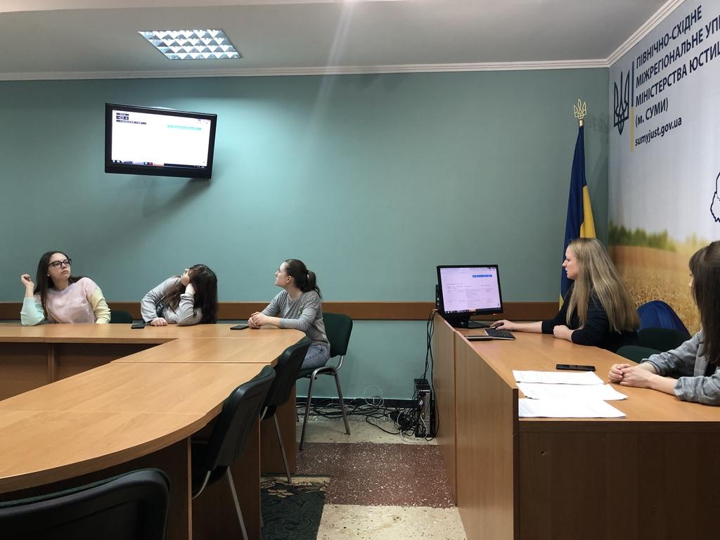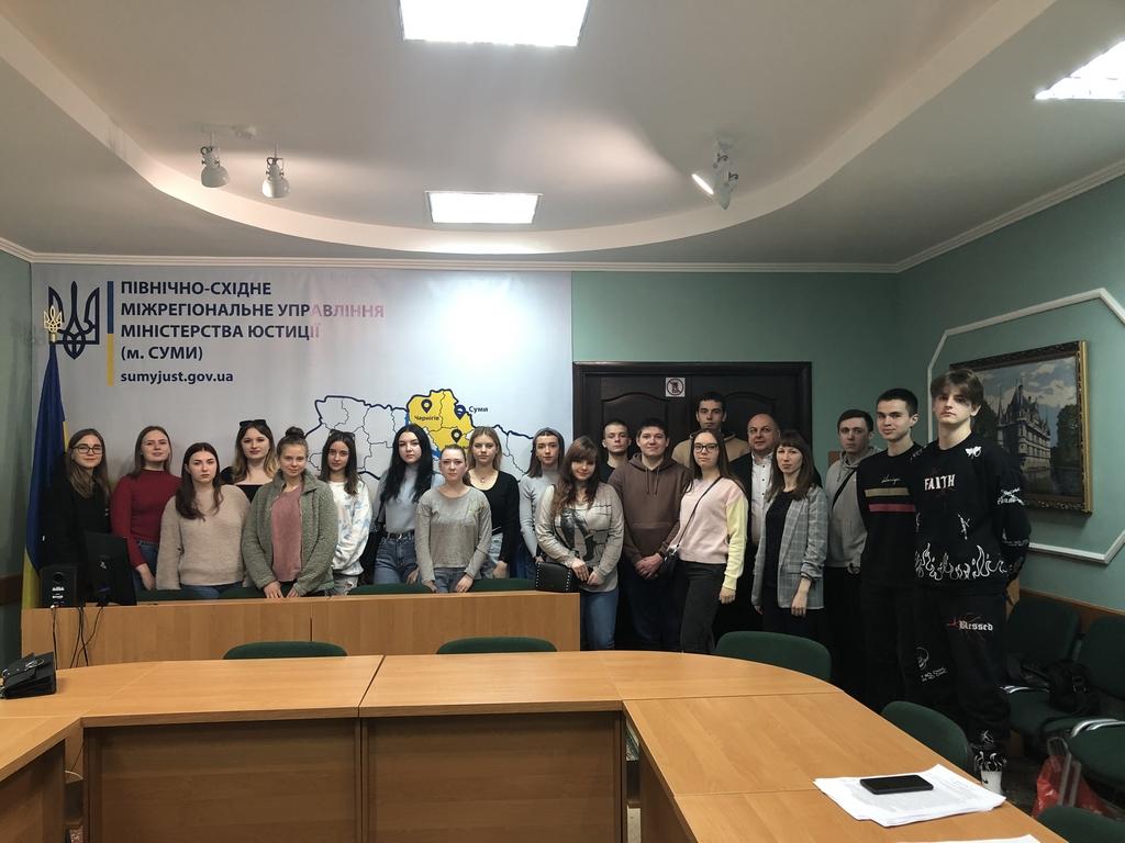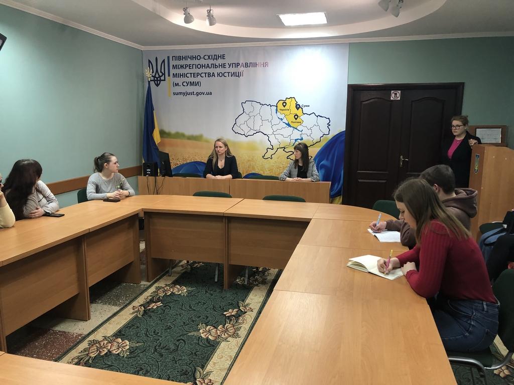 Перед студентами виступила заступник начальника міжрегіонального управління – начальник Управління забезпечення примусового виконання рішень у Сумській області Марина Рудь. Вона розповіла про особливості застосування Закону України «Про органи та осіб, які здійснюють примусове виконання судових рішень і рішень інших органів» у сучасних умовах. Було зроблено акцент на те, що примусове виконання судових рішень і рішень інших органів (посадових осіб) покладається на органи державної виконавчої служби та у визначених Законом України «Про виконавче провадження» випадках - на приватних виконавців. Студентів ознайомили із державними реєстрами, а саме: Єдиним реєстром боржників; Автоматизованою системою виконавчого провадження; Електронним реєстром апостилів та іншими.