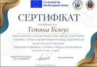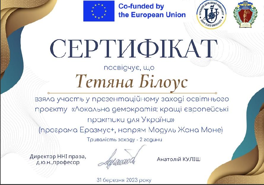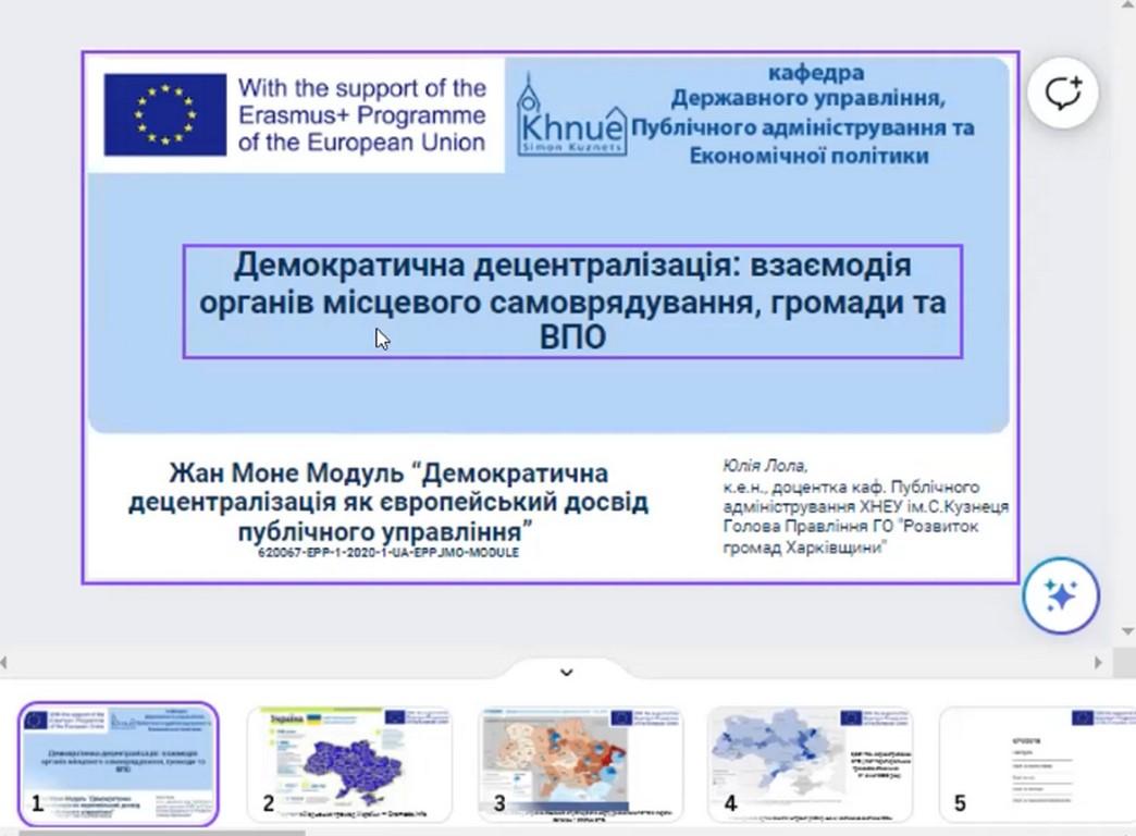 У межах Програми Erasmus+ напряму Модуль Жана Моне доцентка кафедри гуманітарних дисциплін Сумської філії Харківського національного університету внутрішніх справ Тетяна БІЛОУС взяла участь в онлайн-презентації та обговоренні освітнього проєкту «Локальна демократія: кращі європейські практики для України».