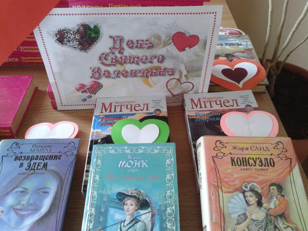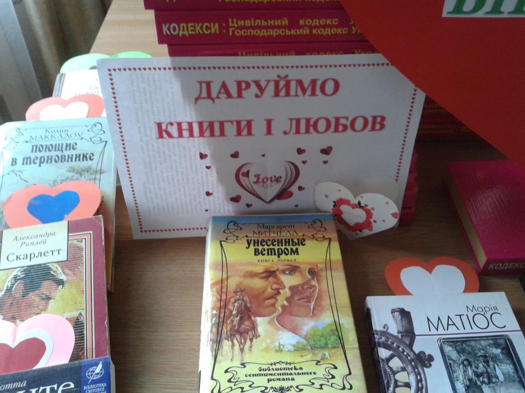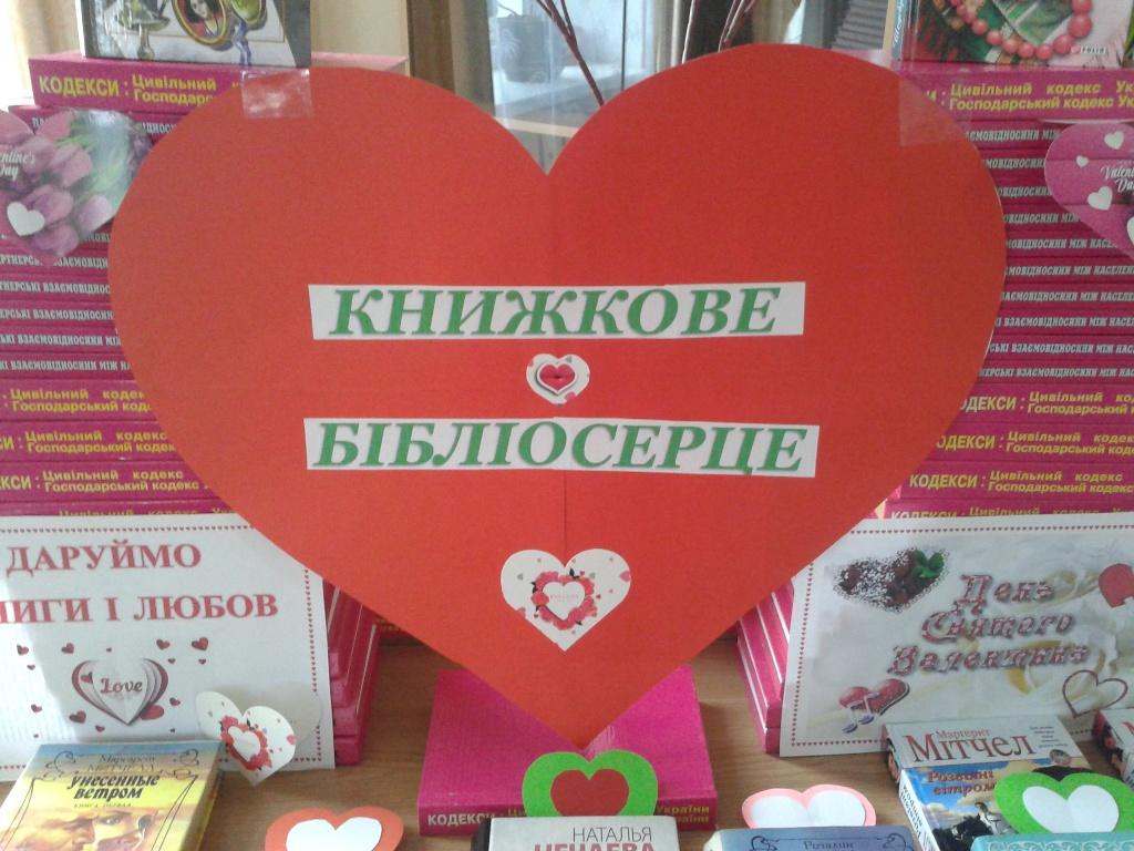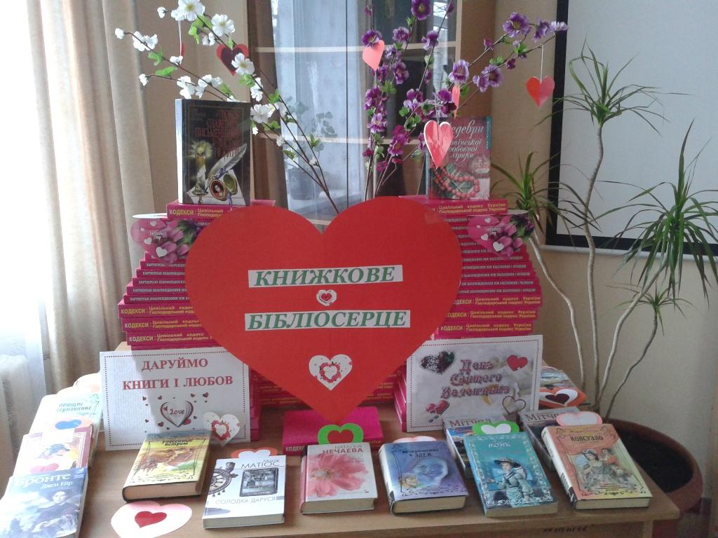 Наближається День Святого Валентина. До відзначення найромантичнішого свята року долучились і працівники бібліотеки філії. Напередодні свята бібліотекарі оформили книжкову виставку - інсталяцію «ДАРУЙМО КНИГИ І ЛЮБОВ»