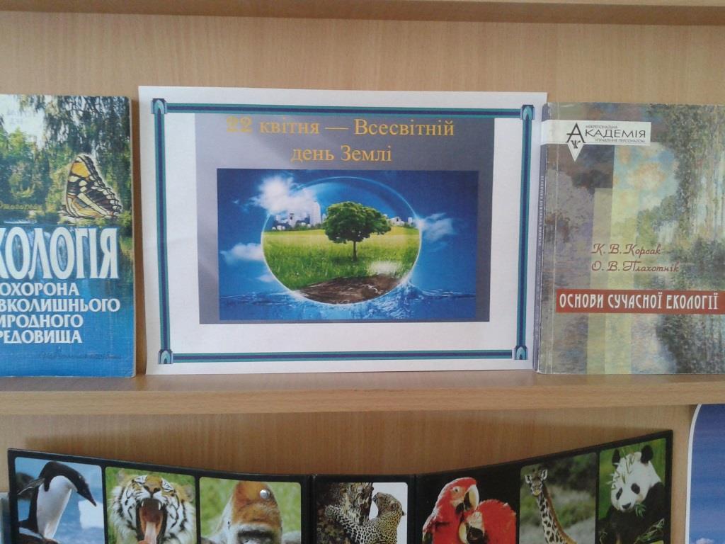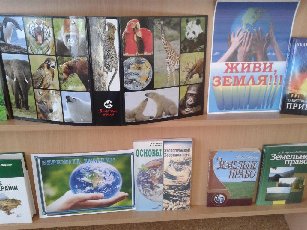 З цієї нагоди в бібліотеці філії експонується екологічна книжкова виставка «Людина і природа: гармонія чи трагедія», яка роповідає про збереження ресурсів нашої планети й охорону навколишнього середовище. Виставка познайомить з книгами з екології, охорони земель, екологічного та земельного права, тощо, розкриває сучасні проблеми забезпечення екологічної безпеки та шляхи її забезпечення.