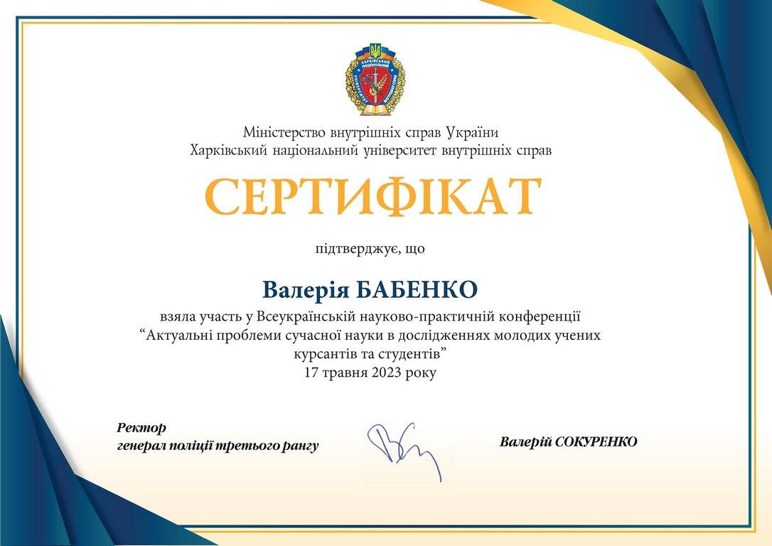 17 травня 2023 року студентка І курсу Сумської філії ХНУВС Вікторія Бабенко взяла участь у Всеукраїнській науково-практичній конференції «Актуальні проблеми сучасної науки в дослідженнях молодих учених, курсантів та студентів», організованою Харківським національним університетом внутрішніх справ. Підготовлені тези наукового дослідження «Історичний розвиток теорії держави і права як науки» під науковим керівництвом професора кафедри юридичних дисциплін Олексія Шуміла.