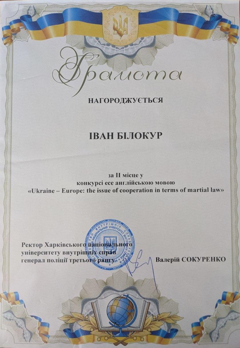 Студент Сумської філії ХНУВС Іван Білокур під керівництвом доцента кафедри гуманітарних дисциплін Ганни Довгополової посів ІІ місце в конкурсі есе англійською мовою «Ukraine – Europe: the issue of cooperation in terms of martial law». Конкурс було проведено за підтримки Консультативної місії Європейського Союзу в Україні.