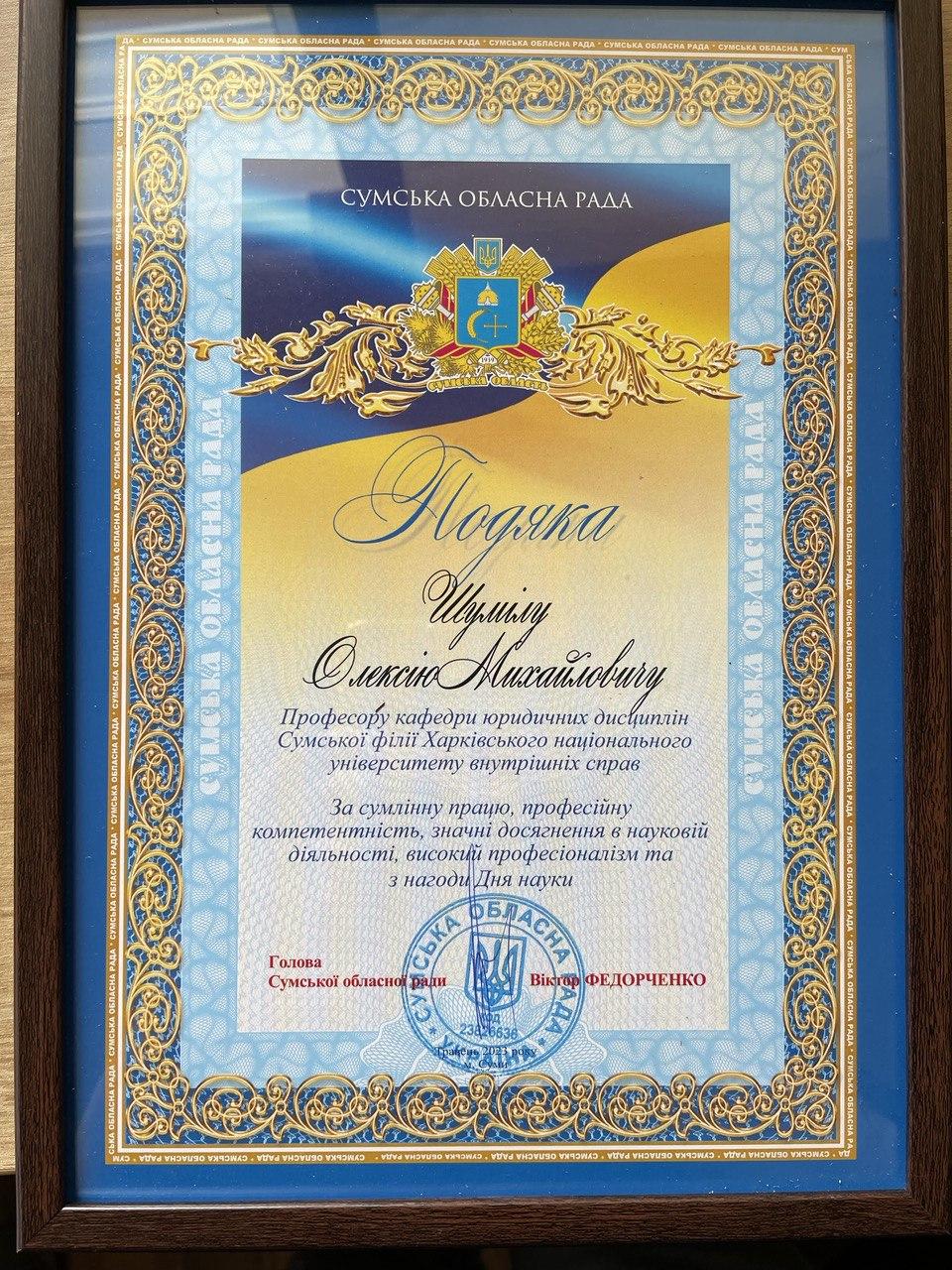 Професор кафедри юридичних дисциплін Сумської філії Харківського національного університету внутрішніх справ Олексій Шуміло за сумлінну працю, професійну компетентність, значні досягнення в науковій діяльності, високий професіоналізм та з нагоди Дня науки отримав Подяку від Голови Сумської обласної ради.