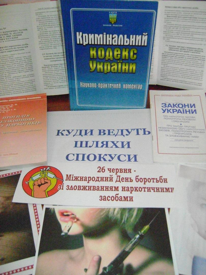 Матеріали, що представлені на виставці покликані надати інформацію про наркотичні речовини, відповідальність за злочини у сфері обігу наркотиків та наслідки їх вживання і застерегти українців від згубного впливу наркотиків.