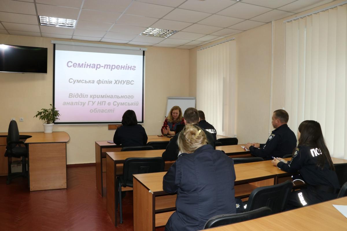 Старший викладач кафедри юридичних дисциплін Сумської філії Харківського національного університету внутрішніх справ Марина Колесник 26 червня 2023 року провела семінар-тренінг для співробітників відділу кримінального аналізу Головного управління Національної поліції в Сумській області.