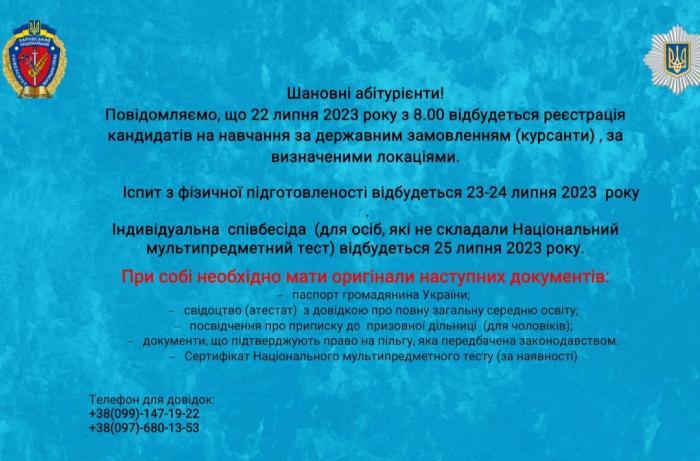 Повідомляємо, що 22 липня 2023 року о 8.00 відбудеться реєстрація кандидатів на навчання за державним замовленням (курсанти) за визначеними локаціями.