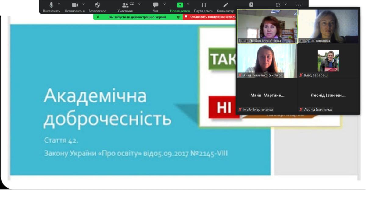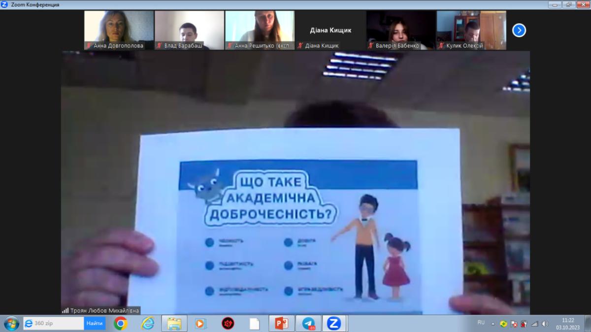 Під час зустрічі обговорили сутність поняття академічної доброчесності та основні законодавчі акти, дотичні до нього. Було розглянуто основні різновиди плагіату як найпоширенішого вияву недоброчесності, серед яких самоплагіат, фабрикація, фальсифікація, списування, переклад іноземного тексту без вказівки джерела та їх можливі наслідки. Здобувачів зацікавив екскурс в історію явища списування, що сягає глибокої давнини, та його причини в сучасному світі.