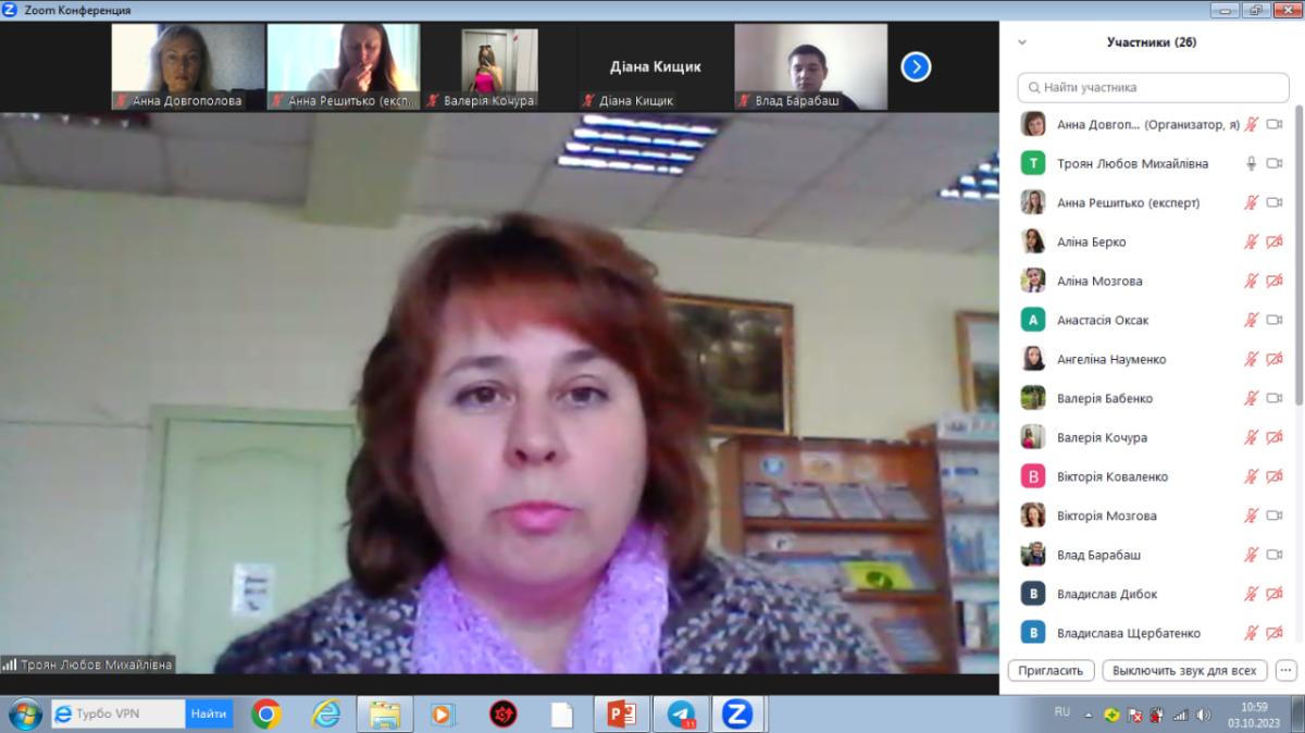 3 жовтня 2023 року було проведено бінарне заняття з дисципліни «Іноземна мова» за темою «Цивільне право» для другокурсників спеціальності Право, присвячене актуальним питанням академічної доброчесності. Заняття, на яке було запрошено провідного бібліотекара Центральної міської бібліотеки ім. Т.Г. Шевченка м. Суми Любов Троян, провели доцент кафедри гуманітарних дисциплін Сумської філії ХНУВС Ганна Довгополова та старший викладач цієї ж кафедри Анна Решитько.