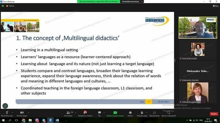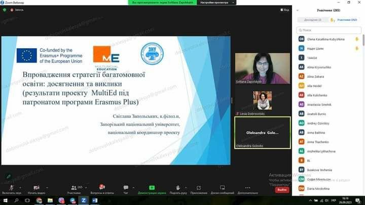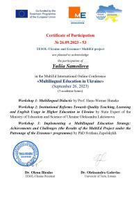 26 вересня 2023 року доцент кафедри гуманітарних дисциплін Юлія Самойлова взяла участь у міжнародній онлайн-конференції «Багатомовна освіта: перспективи для України» в межах проєкту «Розвиток потенціалу підготовки вчителів іноземної мови як шлях до впровадження багатомовної освіти та європейської інтеграції в Україні/ MultiEd» програми ЄС Еразмус+. Модератором конференції виступила європейський координатор проекту MultiEd, канд.філол.наук Олександра Головко (Тартуський університет).
