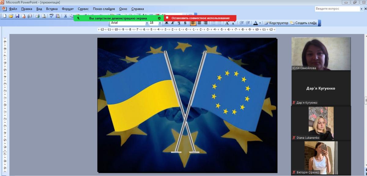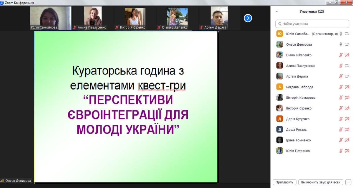 Важливість євроінтеграції для розвитку нашої країни сьогодні є беззаперечною. Відповідно до плану роботи куратора доцентом кафедри гуманітарних дисциплін Сумської філії ХНУВС Юлією Самойловою зі здобувачами вищої освіти 2 курсу спеціальності Правоохоронна діяльність було проведено кураторську годину з елементами квест-гри на тему «Перспективи євроінтеграції для молоді України».