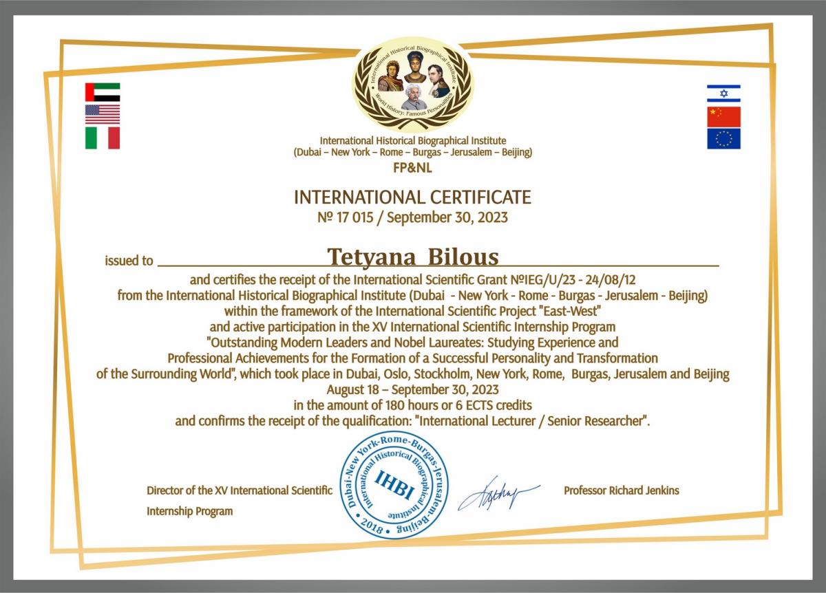 Важливою, дієвою і перспективною формою міжнародної співпраці вважаються міжнародні стажування викладачів. Відтак доцентки кафедри гуманітарних дисциплін Сумської філії ХНУВС Тетяна Білоус, Ганна Довгополова, Анна Решитько з 18 серпня по 30 вересня 2023 року пройшли підвищення кваліфікації міжнародного наукового стажування (180 год./ 6 кредитів ECTS) та отримали Міжнародний Сертифікат.