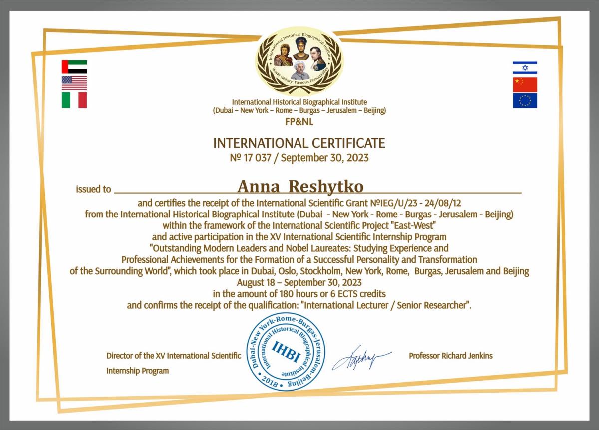 Метою даного наукового стажування є підвищення рівня теоретичної та практичної підготовки, набуття досвіду провадження науково-дослідної діяльності, забезпечення інформаційного обміну та розширення наукових контактів, а також вдосконалення та набуття необхідних загальних і професійних практичних компетентностей. Розробник Програми підвищення кваліфікації – International Historical Biographical Institute (Dubai - New York – Rome – Burgas - Jerusalem - Beijing).