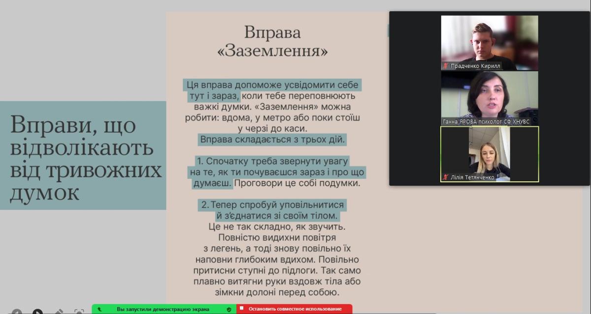 Під час тренінгових занять студенти та курсанти Сумської філії мали можливість опанувати дієві вправи, що відволікають від тривожних думок, знімають напругу у тілі, заспокоюють хвилювання, що в майбутньому допоможе їм піклуватися про власний психоемоційний стан.