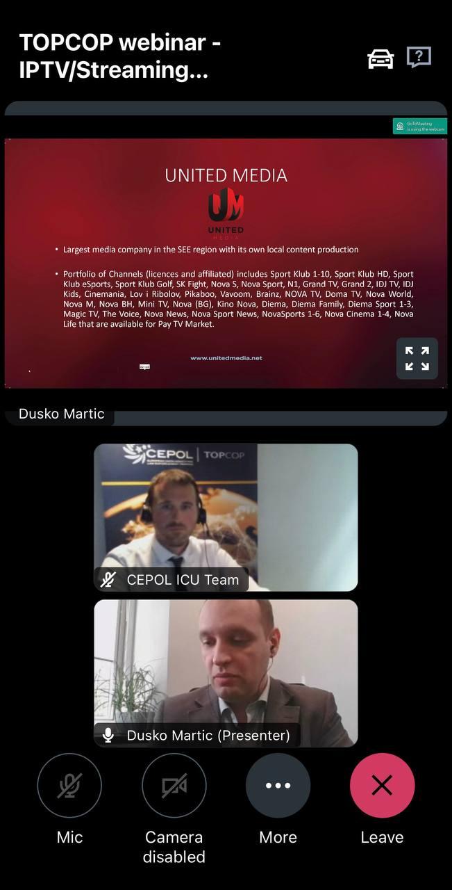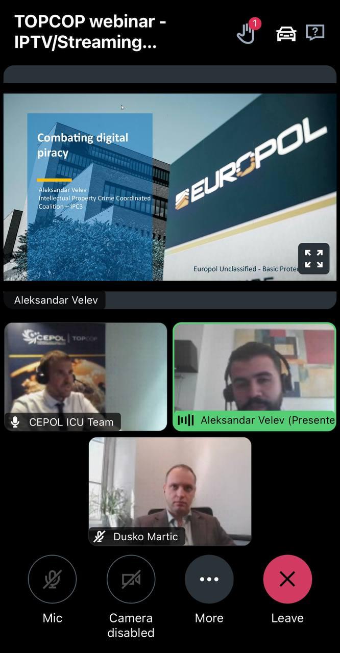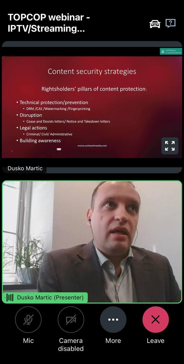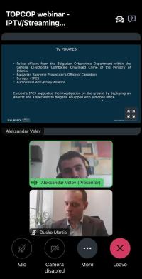 Спікерами даного заходу виступили: експерт з Європолу Олександар Велев, який виступив з доповіддю «Streaming media piracy current landscape and main types of IPTV infringements in this field», та експерт ринку відео-телебачення Душко Мартич, який розповів про «International cooperation methods and tools to counter similar phenomena».