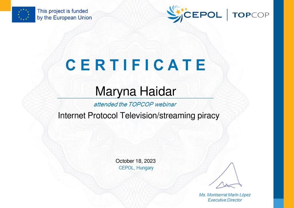 18 жовтня 2023 року здобувачка другого (магістерського) рівня вищої освіти Право (правозастосування) Сумської філії ХНУВС Марина Гайдар взяла участь у вебінарі на тему «IPTV/Streaming piracy» («IP-телебачення/Стрімінгове піратство»), організованому Агенством Європейського Союзу з підготовки співробітників правоохоронних органів у межах проєкту TOPCOP.