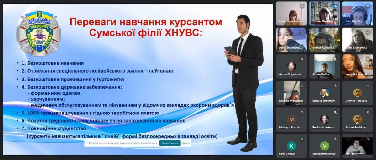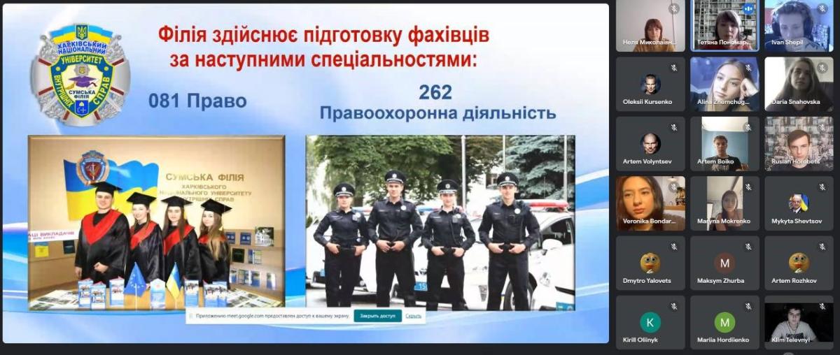 Днями відбувся профорієнтаційний захід «Вступ до Сумської філії ХНУВС. Визначення професійної траєкторії» для випускників КУ Сумська загальноосвітня школа № 20 м. Суми. Доцент кафедри гуманітарних дисциплін Сумської філії ХНУВС Тетяна Пономаренко презентувала спеціальності, за якими відбувається підготовка здобувачів вищої освіти у Сумській філії ХНУВС; акцентувала увагу на перевагах навчання в університеті, а також проінформувала про умови та етапи вступу на означені спеціальності.