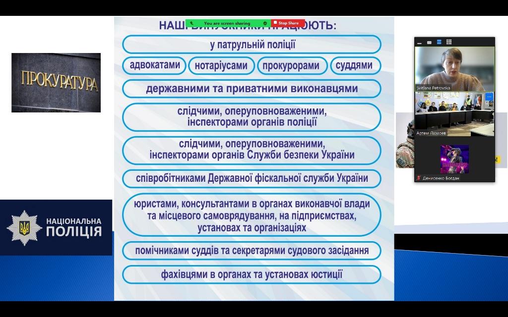 У рамках профорієнтаційної роботи Сумської філії Харківського національного університету внутрішніх справ доцентка кафедри соціально-економічних дисциплін Світлана Петровська провела онлайн зустріч із учнями 11 класу Вільшанського закладу загальної середньої освіти І-ІІІ ступенів.