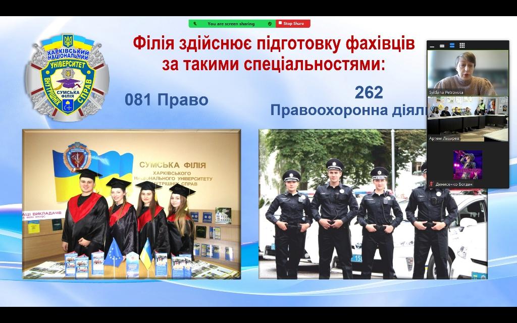 Доповідач презентувала спеціальності, за якими відбувається підготовка здобувачів вищої освіти у Сумській філії ХНУВС, – 081 «Право» та 262 «Правоохоронна діяльність», ознайомила майбутніх вступників із умовами вступу та особливостями підготовки у закладі освіти.