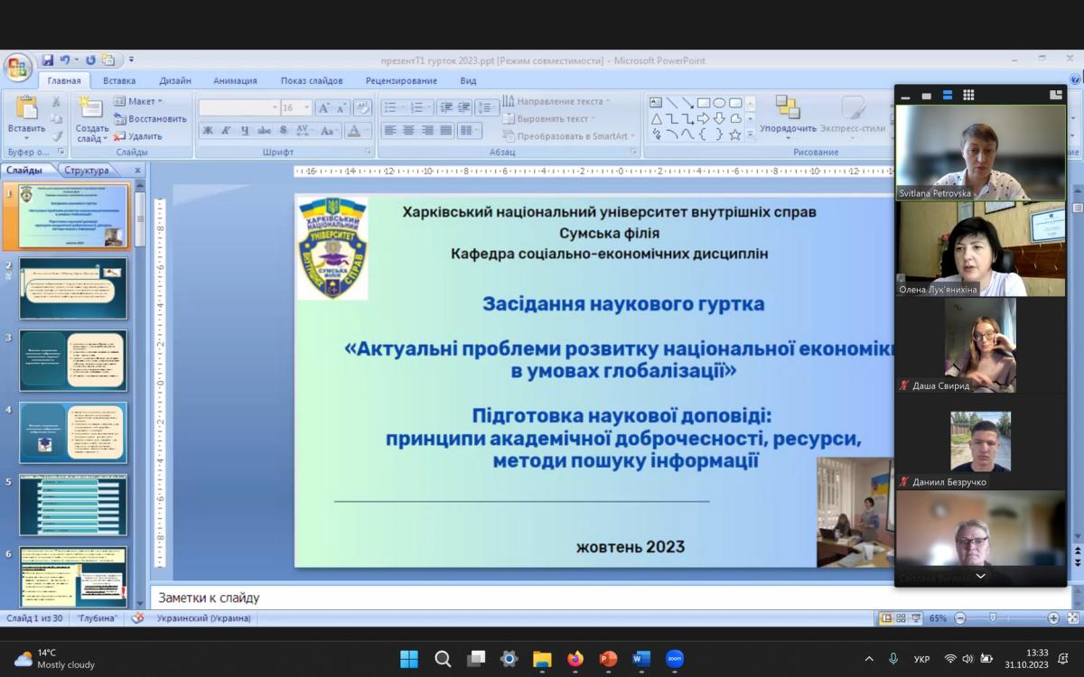 Відповідно до плану відбулося спільне онлайн засідання наукового студентсько-курсантського гуртка кафедри соціально-економічних дисциплін Сумської філії Харківського національного університету внутрішніх справ «Актуальні проблеми розвитку національної економіки в умовах глобалізації» та секції «Проблемні аспекти забезпечення економічної безпеки держави».