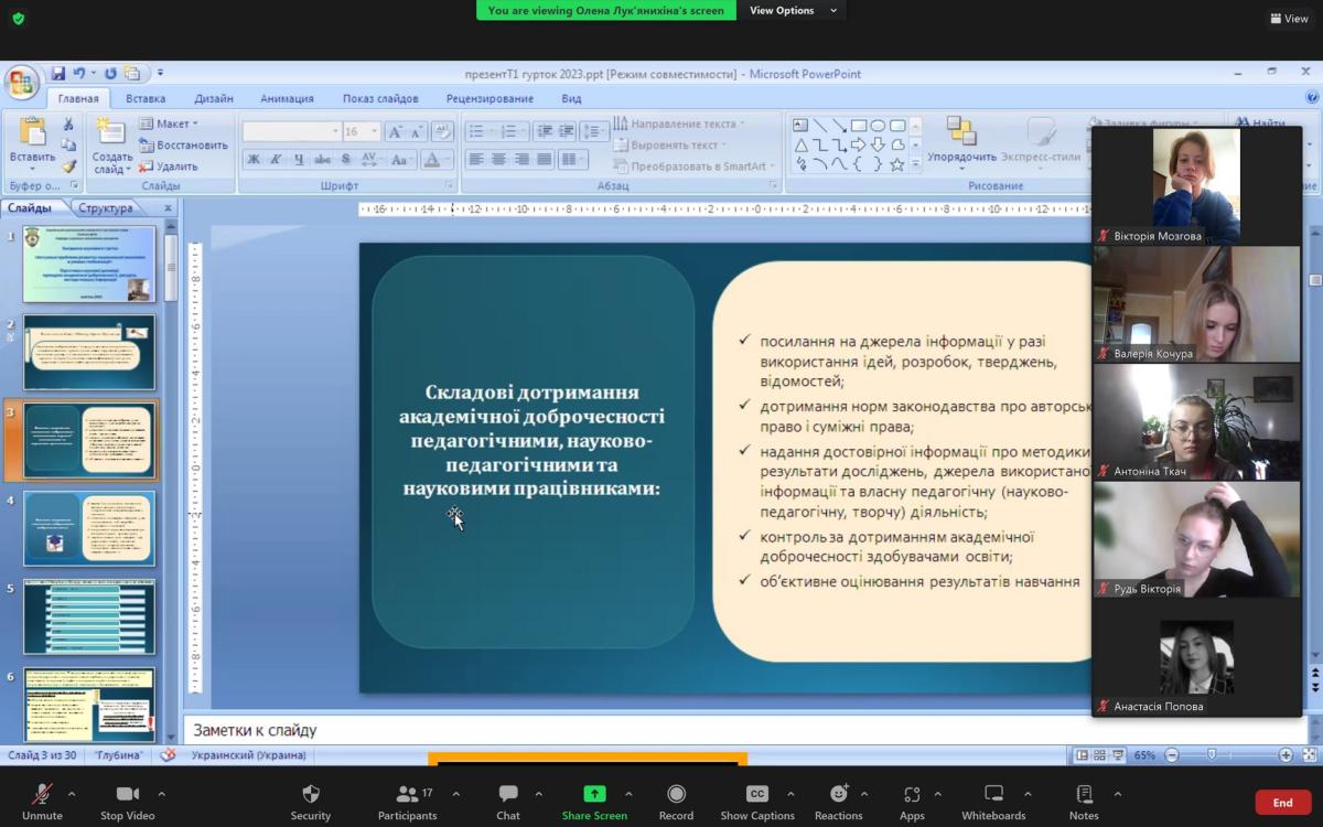 Завідувач кафедри, кандидат економічних наук, доцент Лук’янихіна Олена Анатоліївна провела бесіду на тему «Підготовка наукової доповіді: принципи академічної доброчесності, ресурси, методи пошуку інформації».