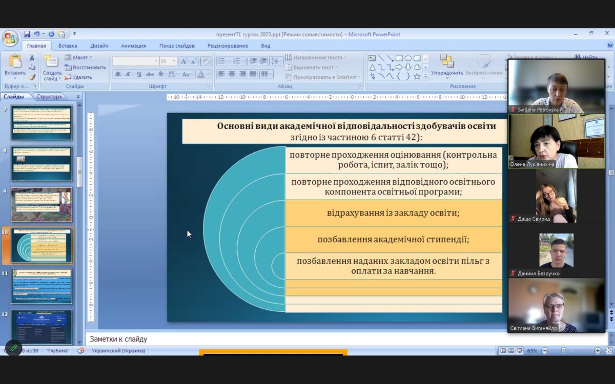 Присутніх було ознайомлено з основними документами Сумської філії ХНУВС, що містять політику, стандарти і процедури дотримання академічної доброчесності. Доповідачка розповіла про сутність, основні види порушень академічної доброчесності та відповідальність відповідно до чинного законодавства як науково-педагогічних працівників, так і здобувачів вищої освіти. Було наголошено на необхідності дотримання доброчесної поведінки здобувачем вищої освіти у рамках освітнього процесу і наукової діяльності. Олена Анатоліївна продемонструвала присутнім основні наукові ресурси та методи пошуку інформації для підготовки наукового повідомлення.