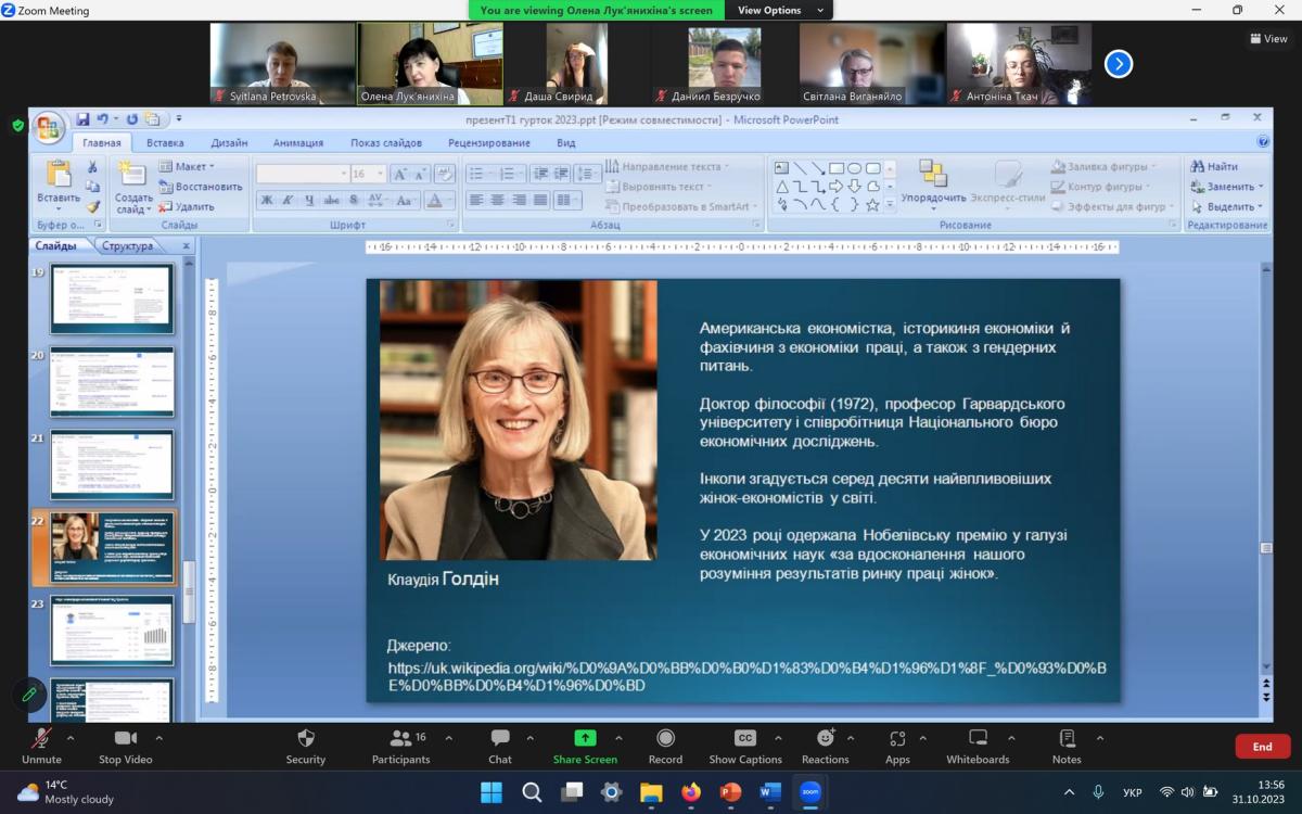 Також Олена Анатоліївна ознайомила гуртківців із Нобелівською лауреаткою 2023 року у галузі економічних наук Клаудією Голдін, яка отримала премію «за поглиблення розуміння позицій жінок на ринку праці».