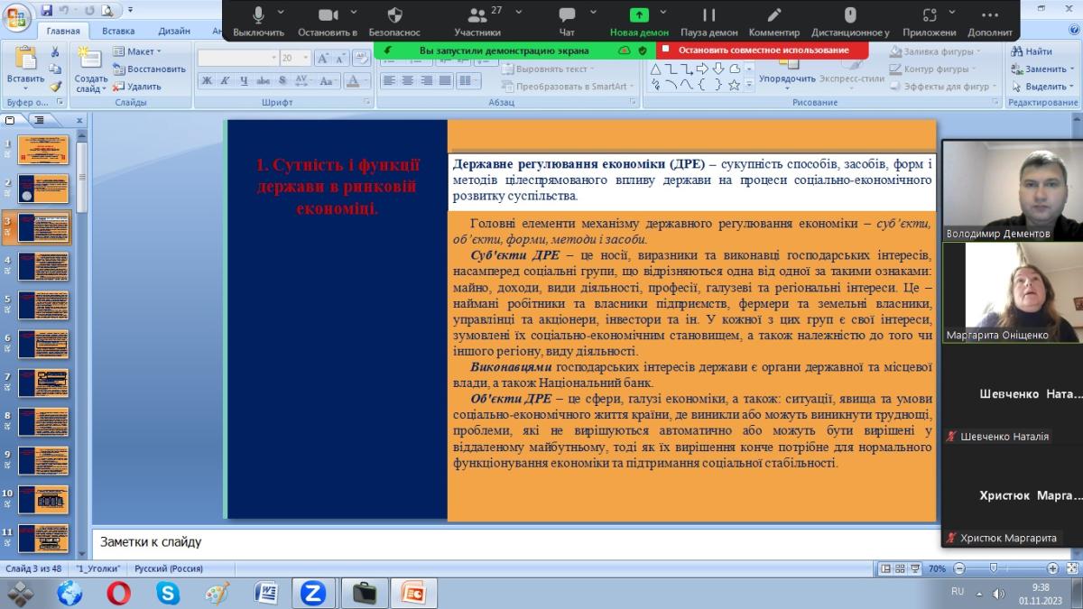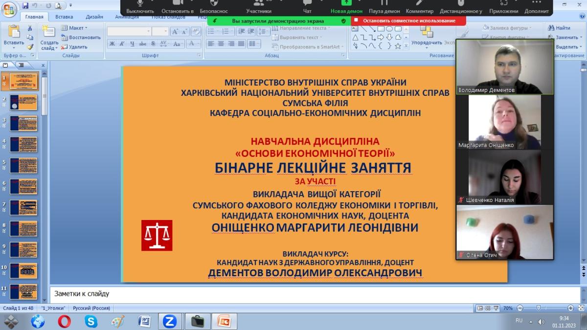 У рамках вивчення навчальної дисципліни «Основи економічної теорії» доцентом кафедри соціально-економічних дисциплін Сумської філії ХНУВС Дементовим Володимиром Олександровичем було організовано та проведено бінарне лекційне заняття з елементами дискусії у форматі ЗУМ-конференції для студентів першого курсу на тему «Засоби і напрями державного регулювання економіки» за участі викладача вищої категорії Сумського фахового коледжу економіки і торгівлі, кандидата економічних наук, доцента Оніщенко Маргарити Леонідівни.