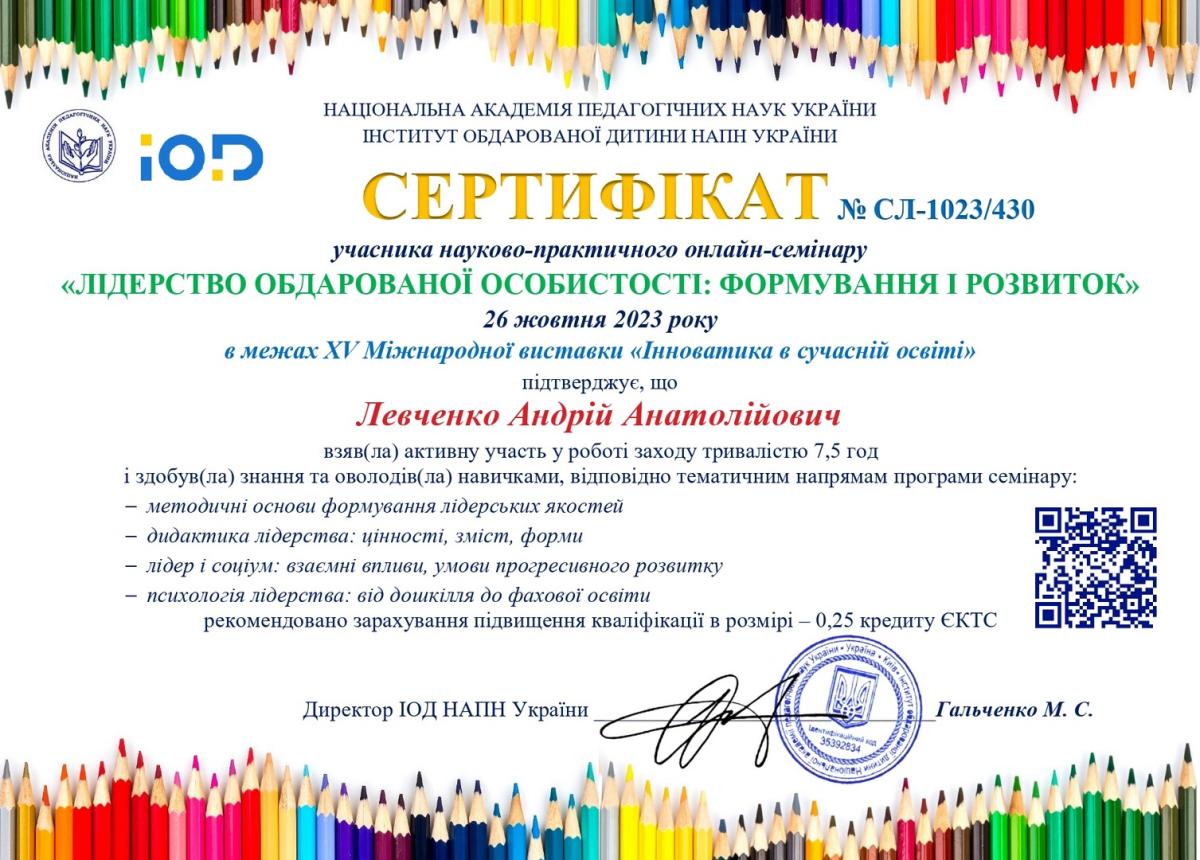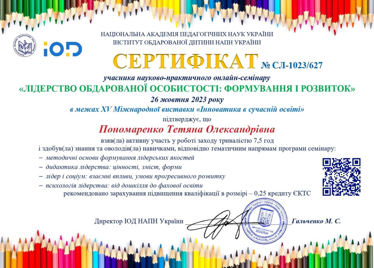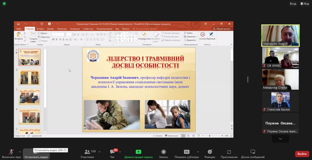 26 жовтня 2023 року кандидат філософських наук, доцент кафедри гуманітарних дисциплін Сумської філії ХНУВС Тетяна Пономаренко та курсант 2 курсу Андрій Левченко взяли участь у роботі науково-практичного онлайн-семінару «Лідерство обдарованої особистості: формування і розвиток» в межах ХV Міжнародної виставки «Інноватика в сучасній освіті».
