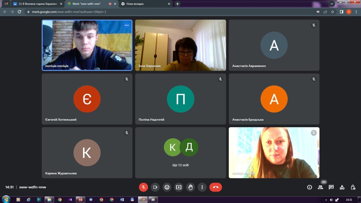 Другу частину зустрічі презентував курсант 3 курсу Сумської філії ХНУВС - Ілля ІЩЕНКО, який детально розглянув питання заборон та обмежень під час воєнного стану, правила поводження із підозрілими предметами, а також правила користування соціальними мережами.