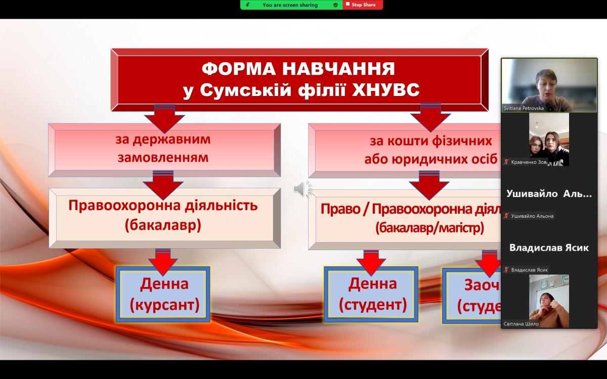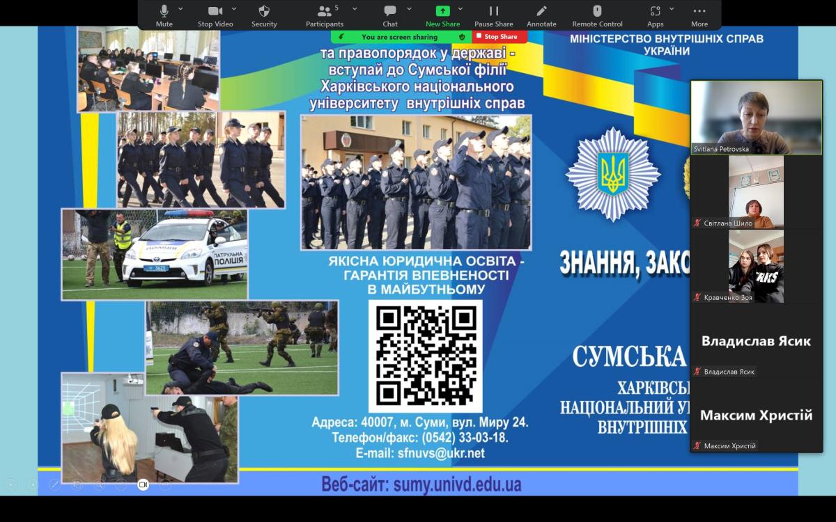 У рамках профорієнтаційної роботи Сумської філії Харківського національного університету внутрішніх справ доцентка кафедри соціально-економічних дисциплін Світлана Петровська провела онлайн зустріч із випускниками Коровинського закладу загальної середньої освіти І-ІІІ ступенів.