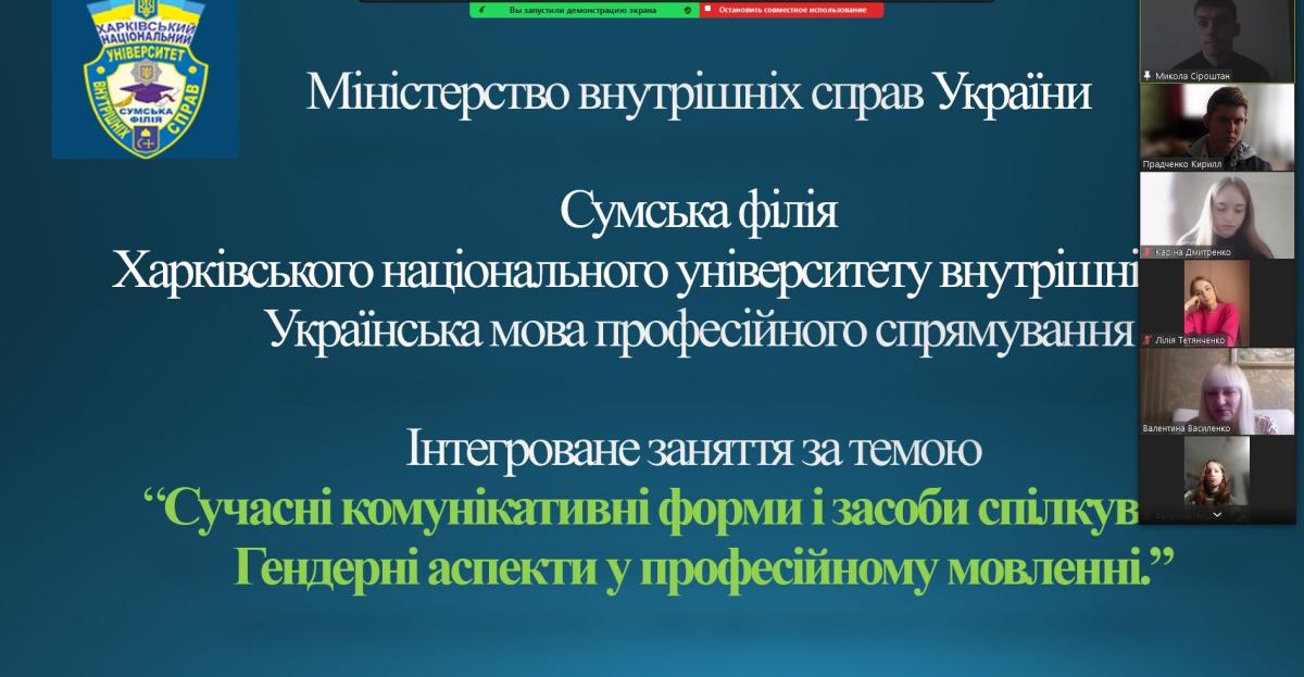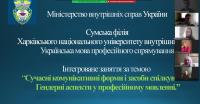 Завідувачка кафедри гуманітарних дисциплін Сумської філії ХНУВС Валентина Василенко провела інтегроване заняття для здобувачів-правників першого курсу у межах навчальної дисципліни «Українська мова професійного спрямування» за темою «Сучасні комунікативні форми і засоби спілкування. Гендерні аспекти у професійному мовленні». Спікером виступив співробітник ВКП Сумського РУП ГУНП в Сумській області лейтенант поліції Микола Сіроштан.