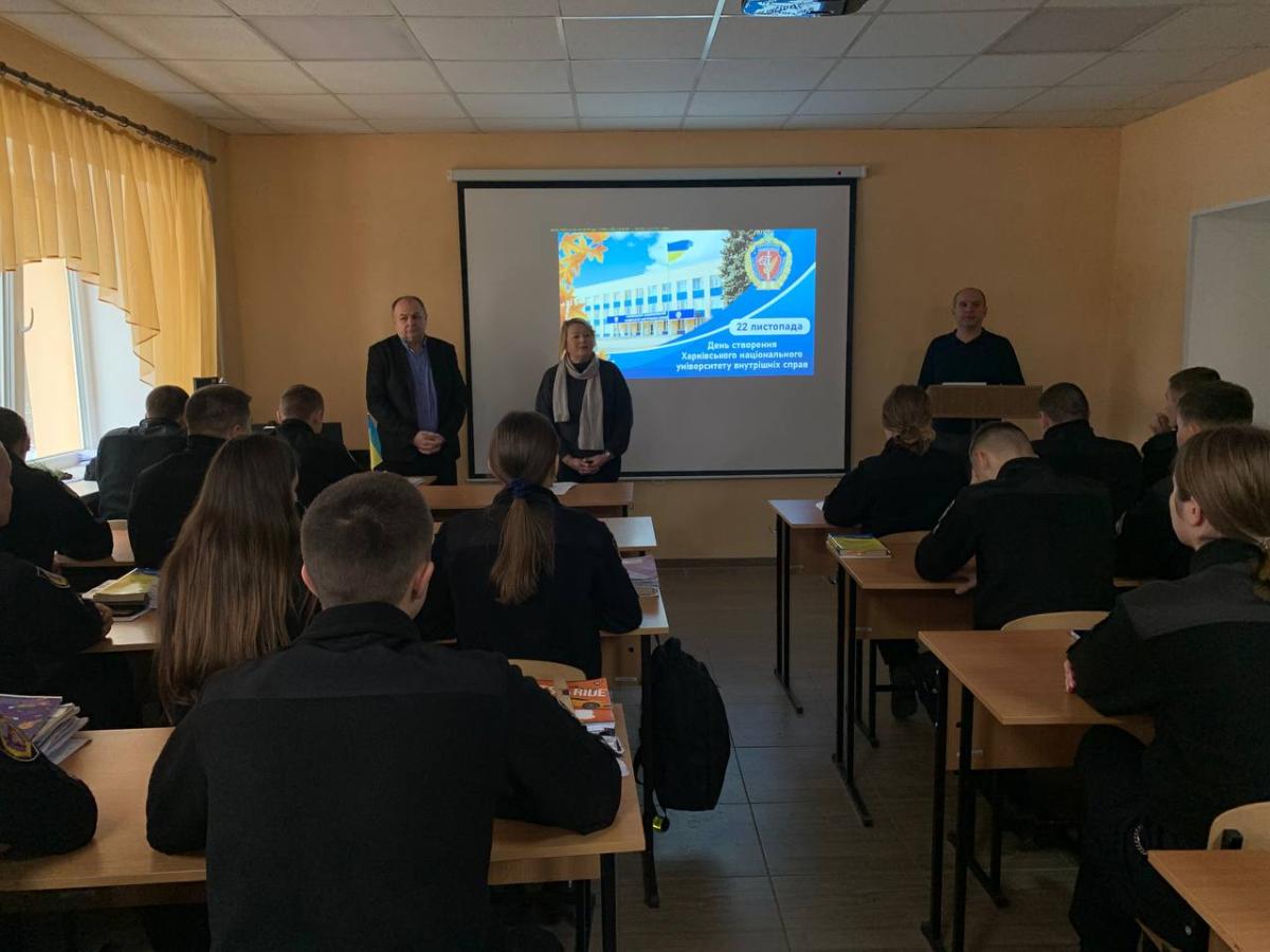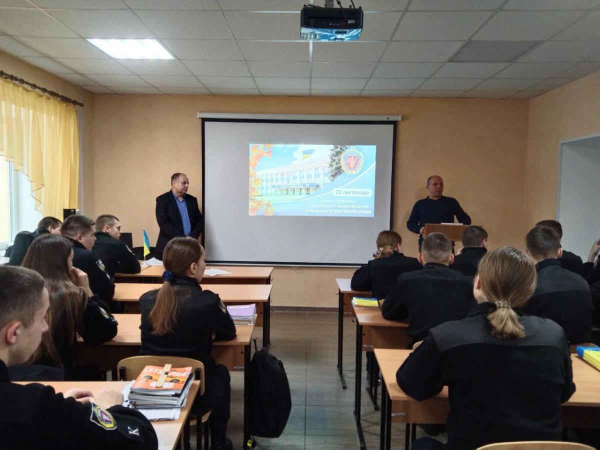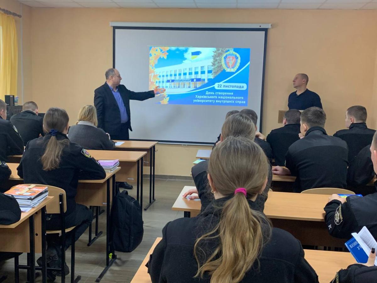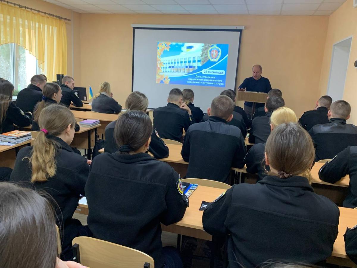 З нагоди Дня заснування Харківського національного університету внутрішніх справ для курсантів другого курсу Сумської філії було проведено виховний захід «Історія моєї Alma mater» за участю викладачів кафедри юридичних дисциплін Сумської філії професора Олексія Шуміла та старшого викладача Андрія Сядристого.