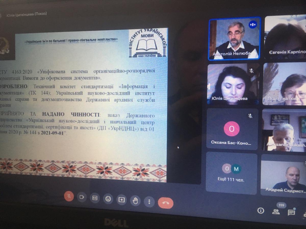 На лекції йшла мова, а потім і жвава дискусія щодо відповідності ДСТУ 4163:2020 «Уніфікована система організаційно-розпорядчої документації. Вимоги до оформлення документів» нормам Конституції України, Цивільного кодексу України та Закону України «Про забезпечення функціонування української мови як державної».
