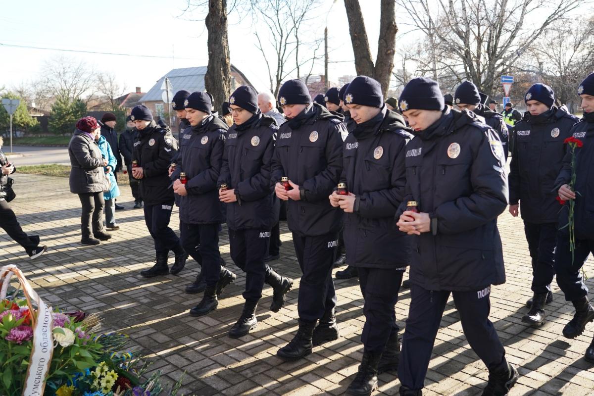 Здобувачі вищої освіти Сумської філії ХНУВС вшанували пам'ять жертв Голодомору. З метою вшанування пам'яті жертв Голодоморів та 90- х роковин Голодомору-геноциду 1932-1933 років здобувачі вищої освіти Сумської філії Харківського національного університету внутрішніх справ взяли участь в мітингу-реквіємі, покладанні квітів до пам'ятного знаку жертв Голодомору 1932-1933 років.