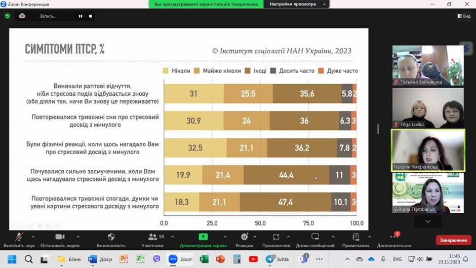 Спікерами дискусійної панелі виступили: Володимир Волошин, директор ГО «Інститут психології здоровʼя», психолог, травматерапевт; Євгенія Курагіна, голова ГО «Асоціація психологів вищої школи України»; Наталія Умеренкова, старша наукова співробітниця лабораторії психології масової комунікації та медіаосвіти, Інститут соціальної та політичної психології НАПН України, голова ГО «Громадський рух «Жіноча Сила України», канд. психол. наук; Людмила Опанасенко, завідувачка навчально-методичного кабінету соціально-психологічної підтримки, професійного розвитку та сприяння працевлаштуванню, Чорноморський національний університет імені Петра Могили, канд. психол. наук; Ольга Ловка, психологиня служби соціальної адаптації та психологічної допомоги КНЕУ ім. Вадима Гетьмана, гештальт-терапевтка, канд. психол. наук; Тетяна Зайчикова, викладачка, акредитована гештальт-терапевтка, супервізорка, провідна тренерка Національної асоціації гештальт-терапевтів України, канд. психол. наук.
