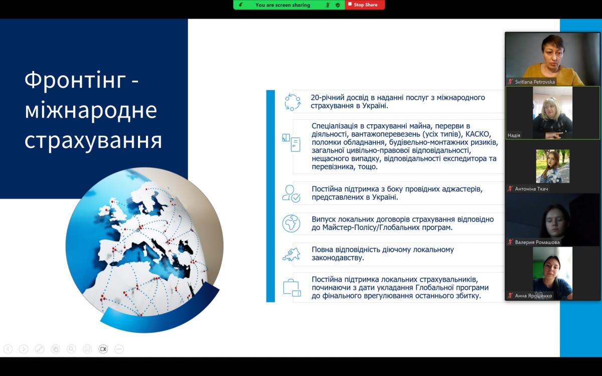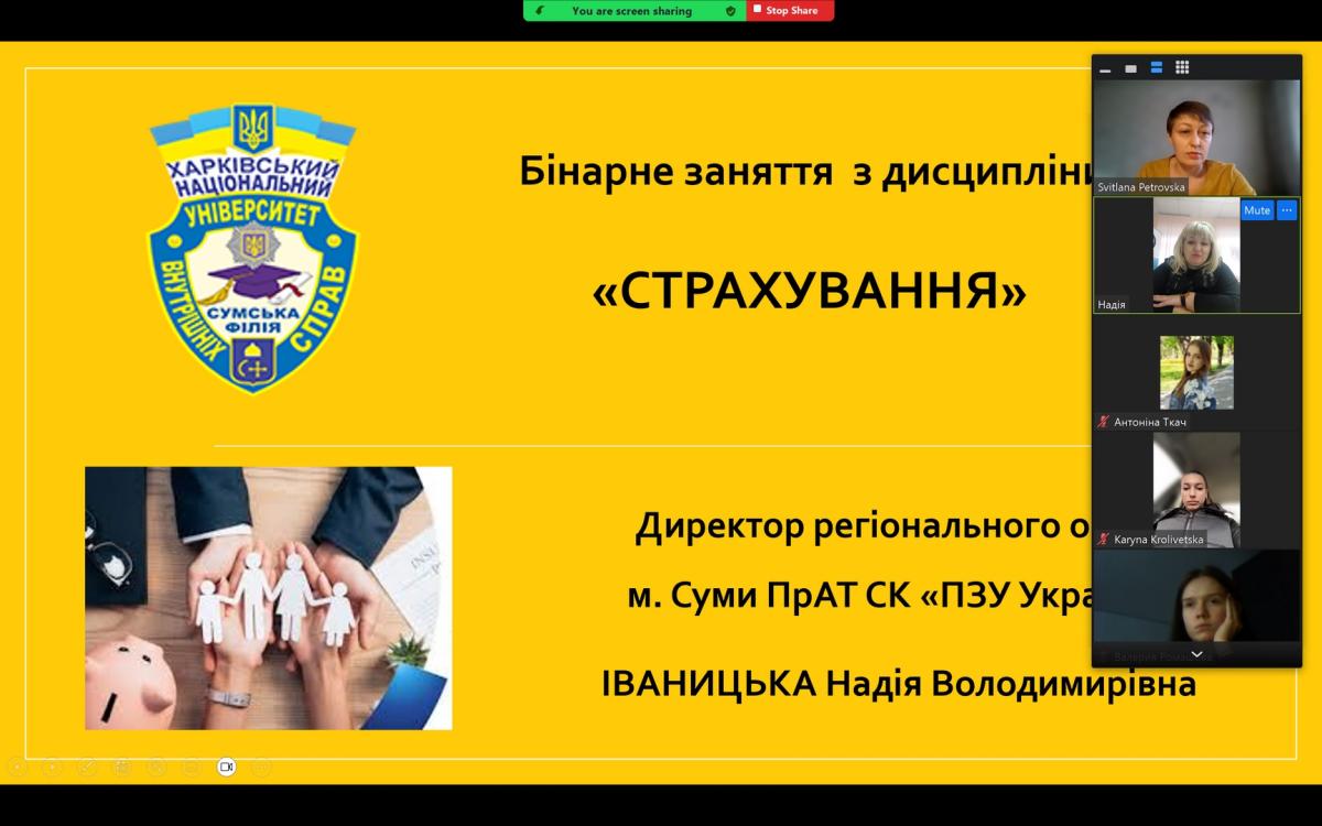 Доцентом кафедри соціально-економічних дисциплін Сумської філії Харківського національного університету внутрішніх справ Світланою Петровською в рамках вивчення дисципліни «Страхування» для студентів третього курсу було організовано проведення онлайн заняття за участю директора регіонального офісу м. Суми ПрАТ СК «ПЗУ Україна» Надії Іваницької.
