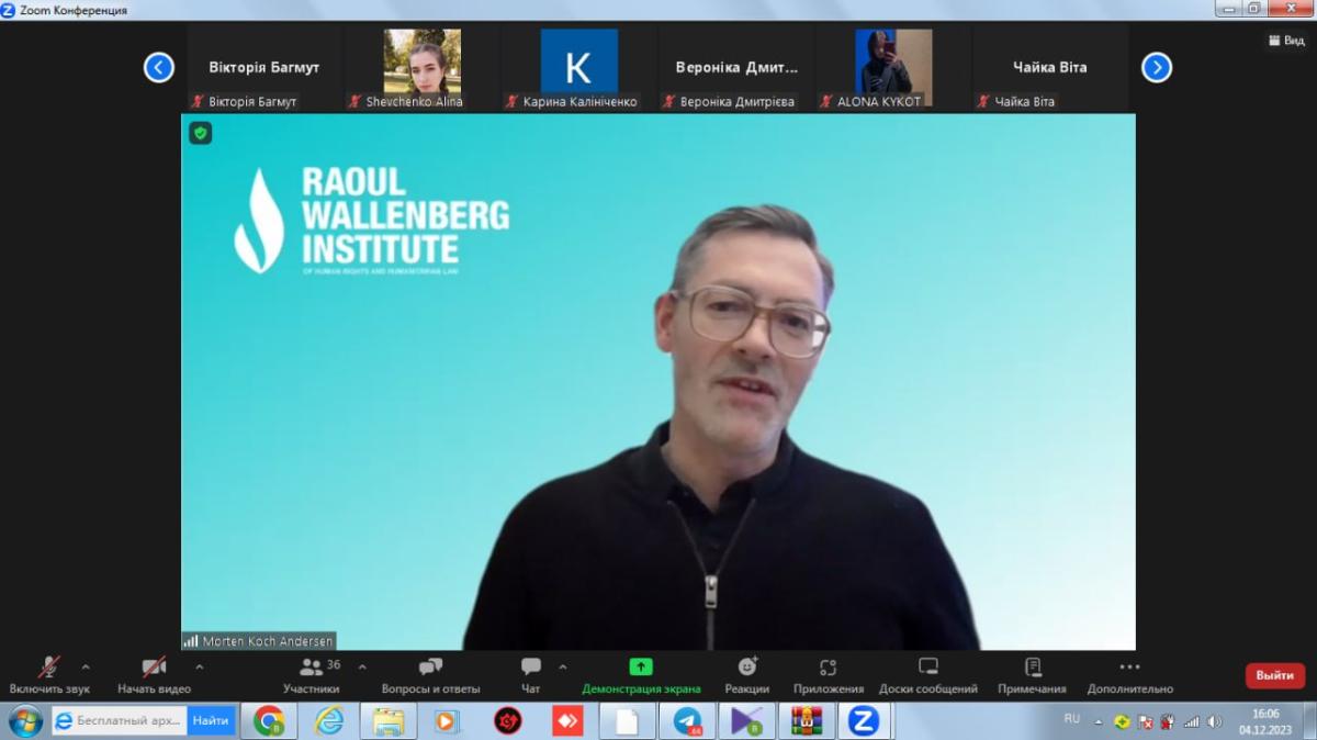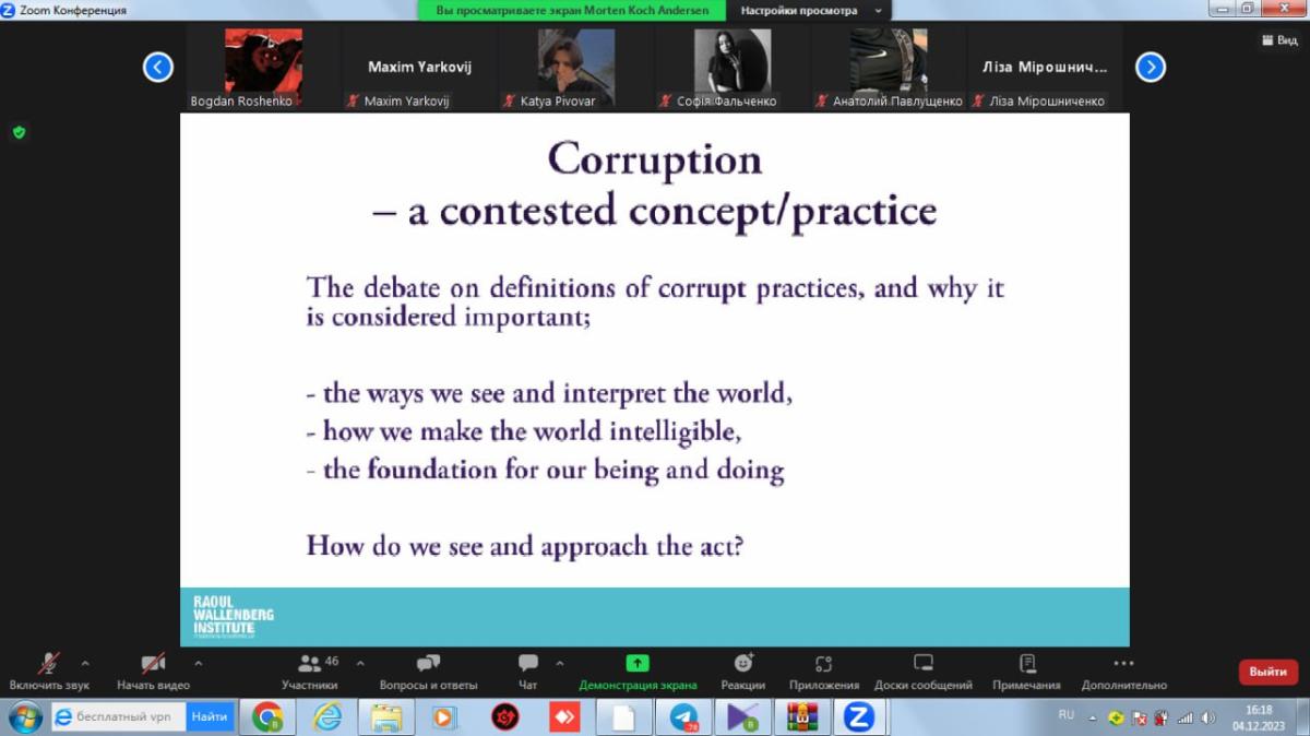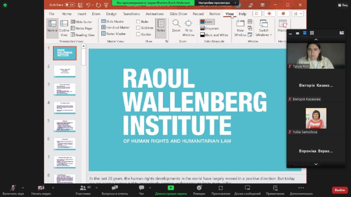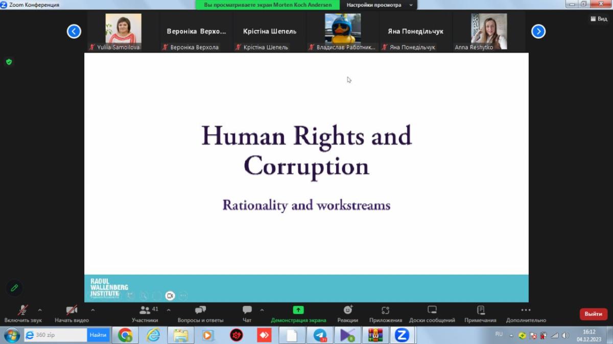 Доценти кафедри гуманітарних дисциплін Сумської філії ХНУВС Юлія Самойлова, Ганна Довгополова та старший викладач цієї кафедри Анна Решитько разом зі здобувачами своїх кураторських груп взяли участь у онлайн-лекції "Взаємозв'язок між правами людини та корупцією - вплив на людей, громади та інституції, а також про те, як ці знання можуть бути використані як запорука справедливого майбутнього". Спікером даного заходу був Мортен Кох Андерсен, заступник директора з досліджень і освіти, старший науковий співробітник Інституту Рауля Валленберга.