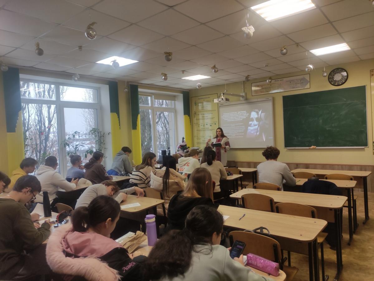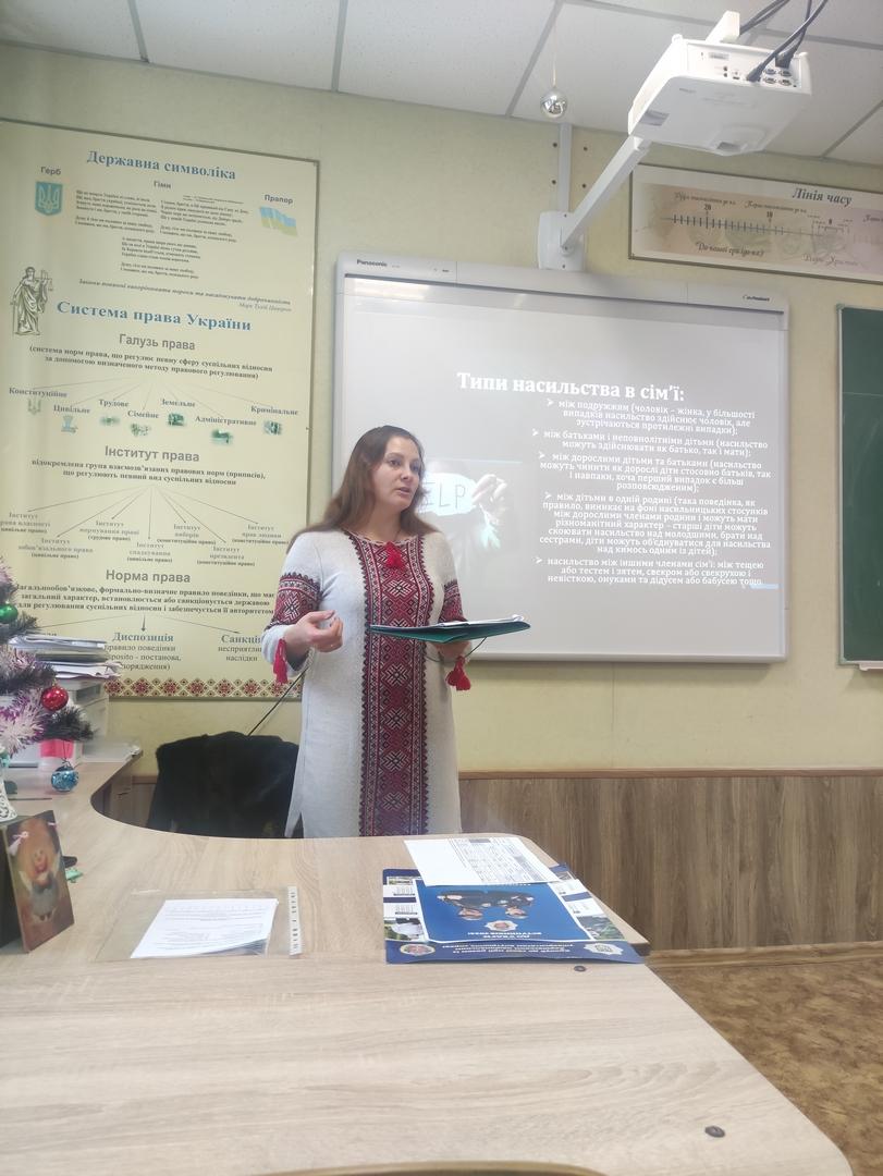 У рамках Всеукраїнської акції “16 днів проти насильства” та з нагоди Міжнародного дня прав людини доцент кафедри соціально-економічних дисциплін Сумської філії ХНУВС Людмила Парфентій завітала до Сумської загальноосвітньої школи І-ІІІ ступенів №12 ім. Б. Берестовського та прочитала для учнів 11 класів лекцію на тему «Домашнє насильство: відповідальність і протидія». Було розглянуто типи та основні ознаки насильства в сім’ї, а також зазначено відповідальність, яку несуть особи, що вчинили домашнє насильство та насильство за ознакою статі.