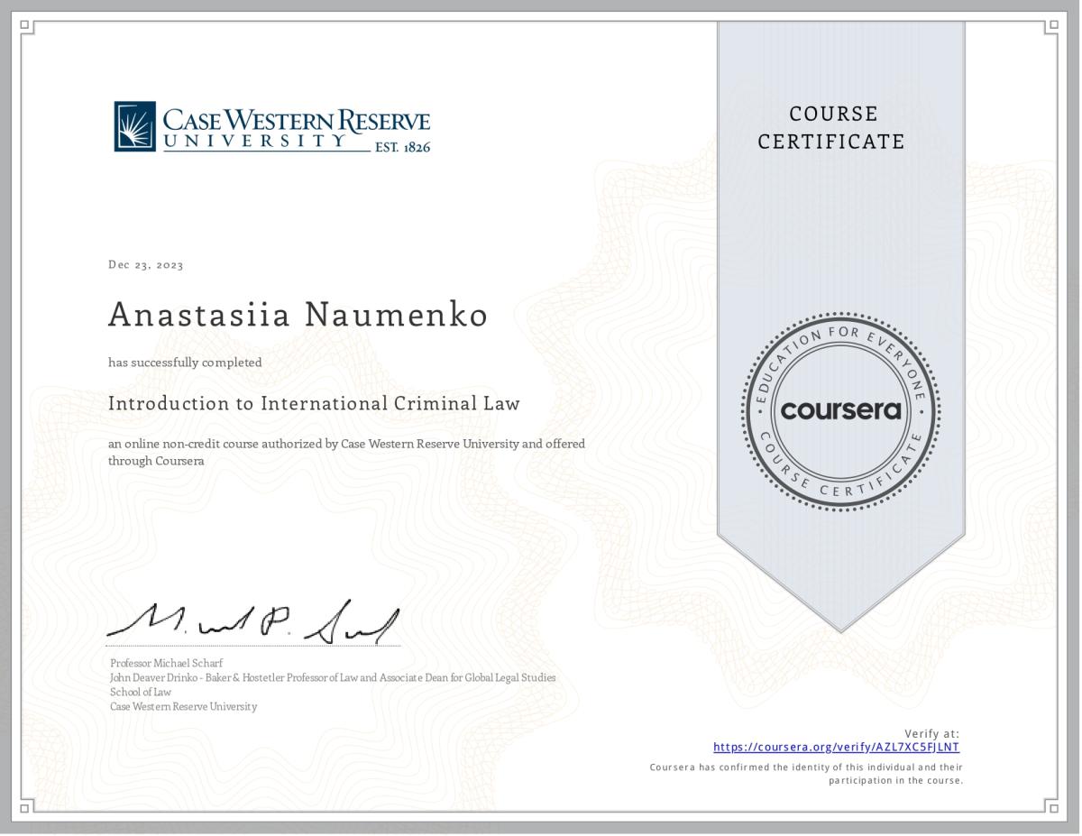 Науменко Анастасія, студентка 4 курсу першого (бакалаврського) рівня вищої освіти за спеціальністю 081 «Право» Сумської філії ХНУВС, у грудні 2023 року взяла участь у онлайн-курсі англійською мовою «Вступ до міжнародного кримінального права», організованого Case Western Reserve University.