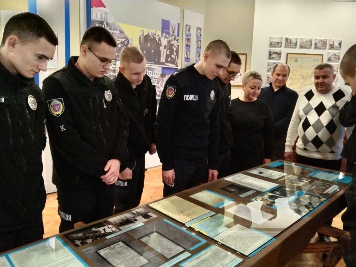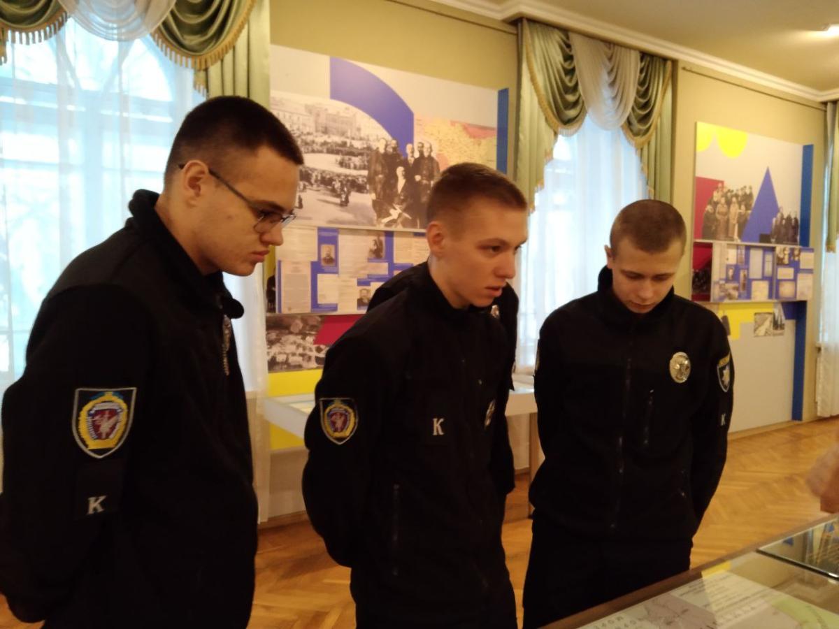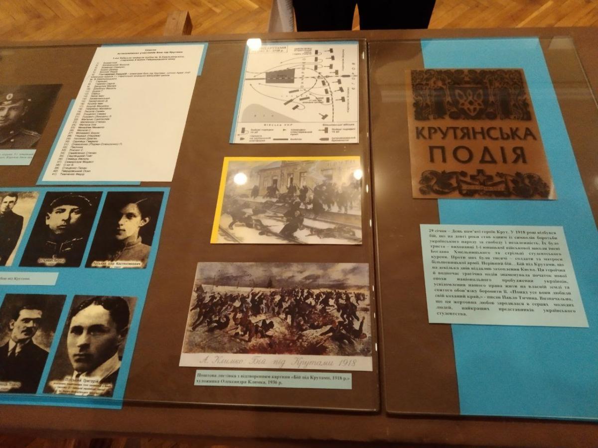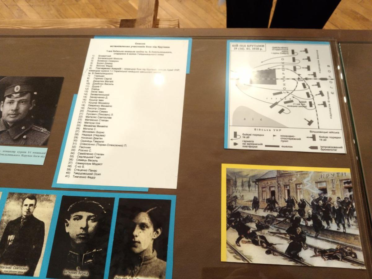 Науковий співробітник музею Олена Любива ознайомила курсантів із матеріалами виставки «За Соборну Україну», в якій представлені документи та фото з фондів музею та центральних архівних установ України; розповіла про історичні обставини та передумови бою під Крутами, переглянувши документи, в яких висвітлені спогади учасників тих подій та інші матеріали.