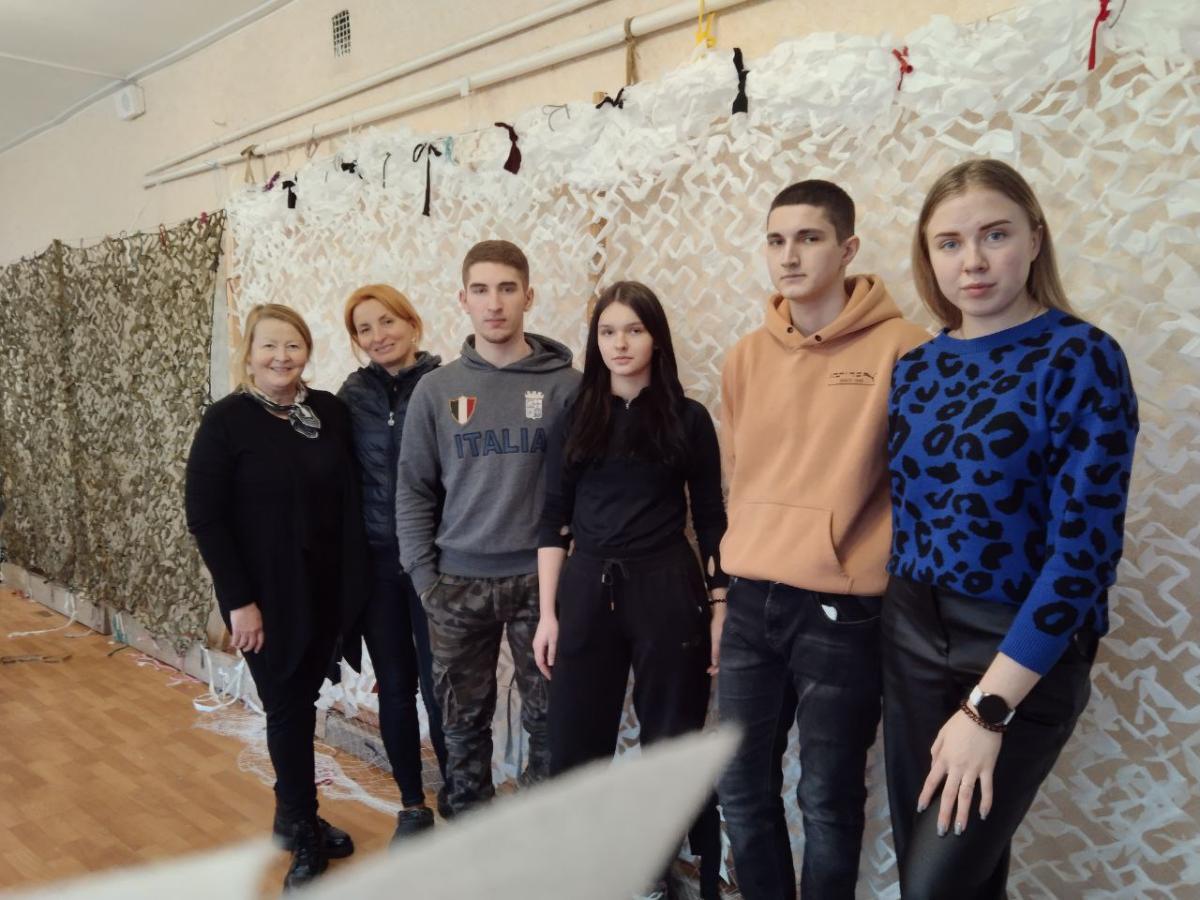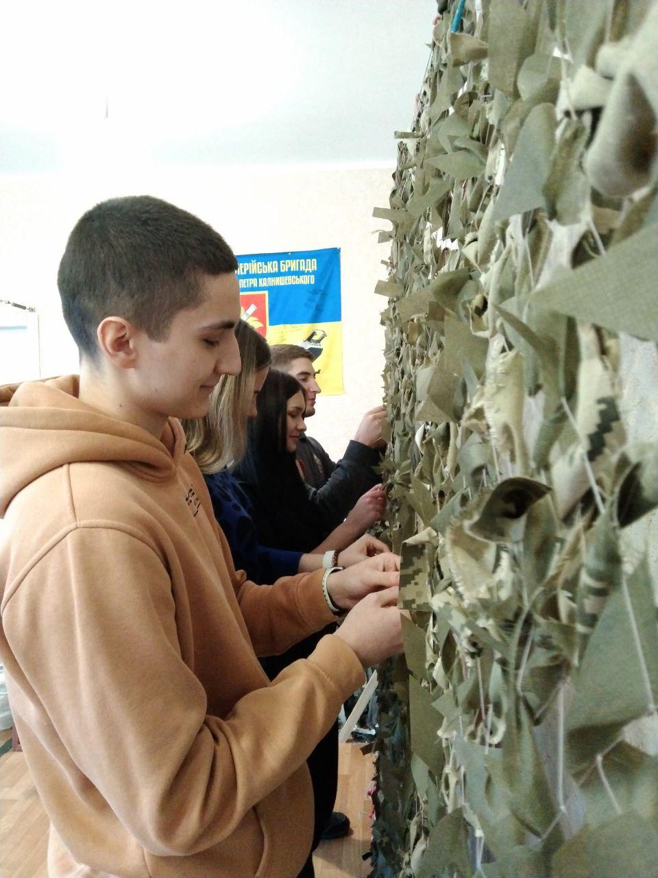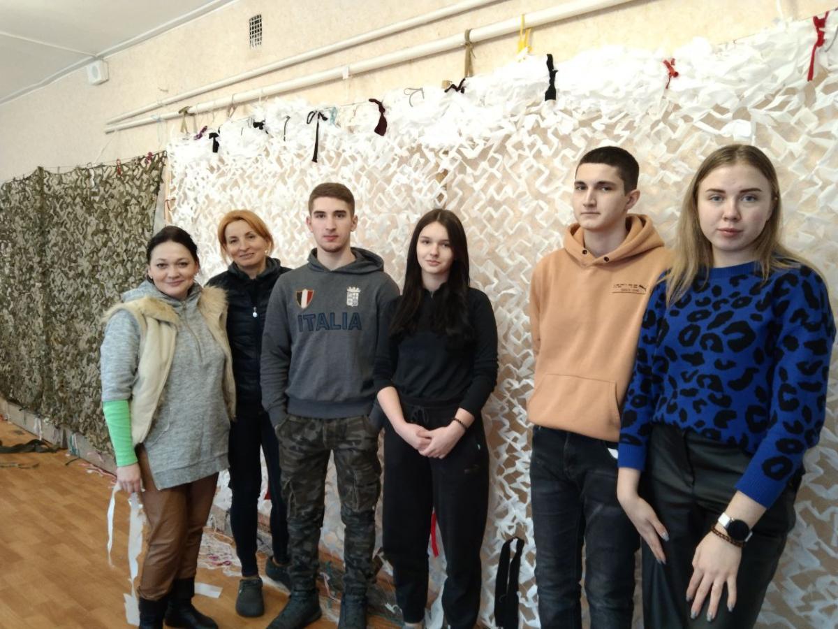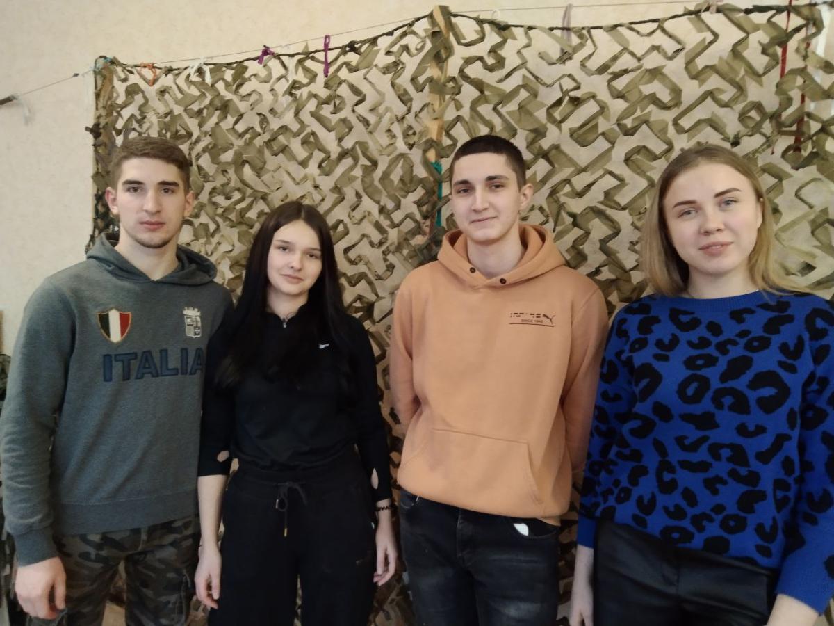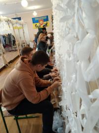 02 лютого волонтери Сумської філії Харківського національного університету внутрішніх справ, які навчаються на першому курсі спеціальності «Право», Катерина Красій, Віталій Кийков, Глеб Курдес та Анастасія Колодченко разом із провідним фахівцем Ганною Мітітєл в черговий раз прийшли до волонтерського центру «Моторний вулик» з метою допомогти плести маскувальні сітки.