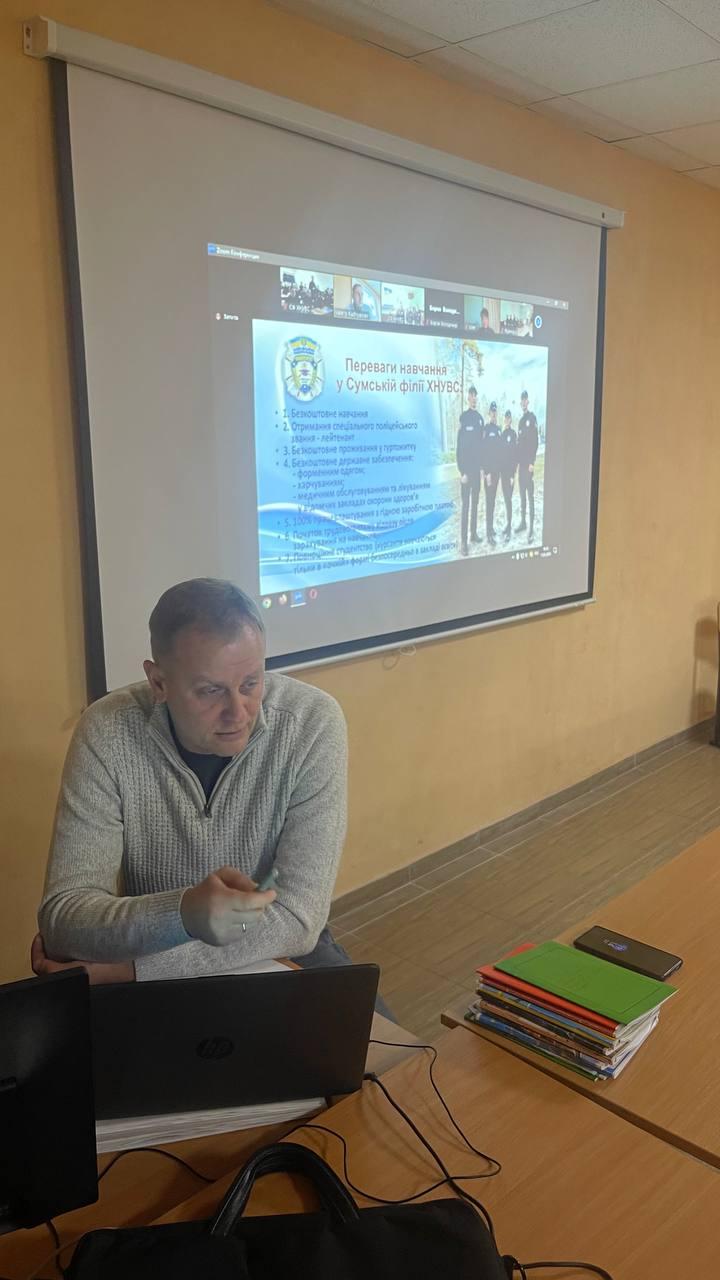 В ході зустрічі було надано детальну інформацію щодо навчання курсантів та студентів за спеціальностями «Право» та «Правоохоронна діяльність», умови вступу, переваги здобуття вищої освіти та навчання в Сумській філії Харківського національного університету внутрішніх справ.