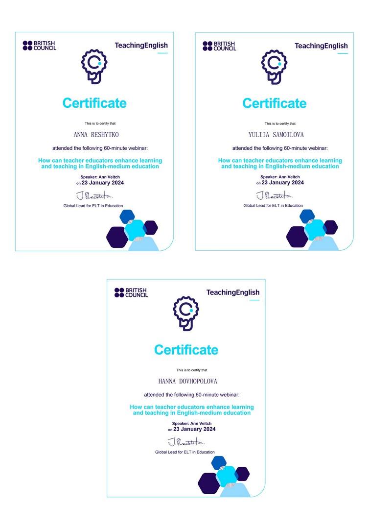 Спікер вебінару Енн Вейтч, керівник проєкту «Англійська в багатомовному світі» Британської Ради, наголосила, як підходи до англійської мови як мови навчання та викладання можуть допомогти покращити результати навчання студентів. Було також проаналізовано шляхи співпраці викладачів англійської мови та викладачами-предметниками, які використовують англійську мову як мову викладання, щоб створити середовище, в якому здобувачі розвиватимуть як свої навички англійської мови, так і свої предметні знання.