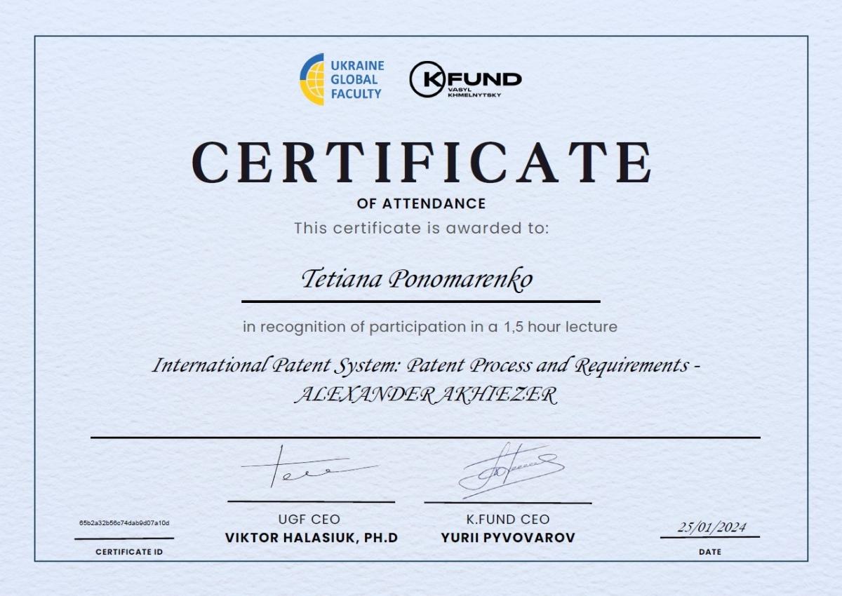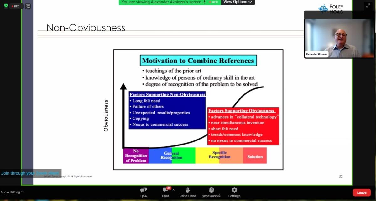 Доцент кафедри гуманітарних дисциплін Сумської філії ХНУВС Тетяна Пономаренко взяла участь у лекції «Міжнародна патентна система: процес патентування та вимоги» від партнера юридичної фірми Foley Hoag LLP (Бостон, штат Массачусетс, США), який увійшов до рейтингу The Best Lawyers in America (у галузі патентного права), доктора юридичних наук Олександра Ахієзера.
