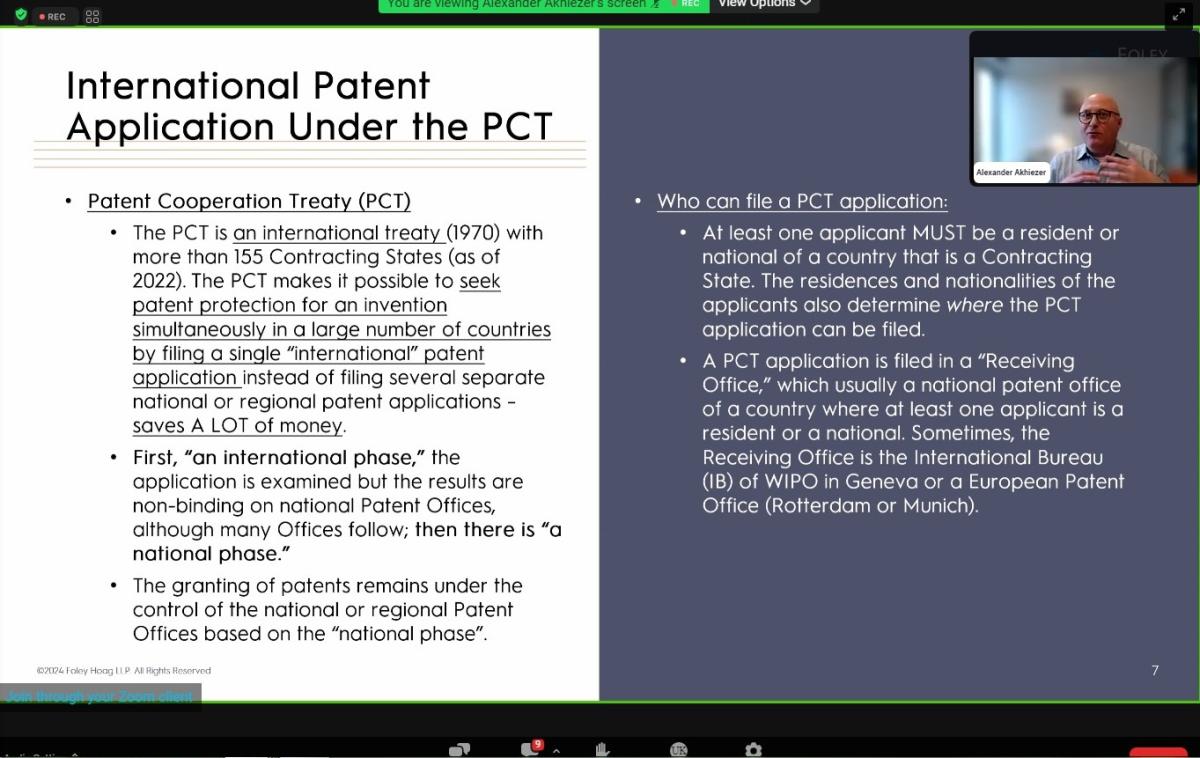 В ході обговорення та під час розгляду презентованих прикладів учасники лекції дізналися про тонкощі Договору про патентну кооперацію (PCT) та його процедури для міжнародних патентних заявок, а також основні вимоги до патентних заявок у Сполучених Штатах Америки та в усьому світі, що охоплюють такі аспекти, як відповідність об’єкту наукового дослідження, новизна, винахідницький рівень та перспективи.