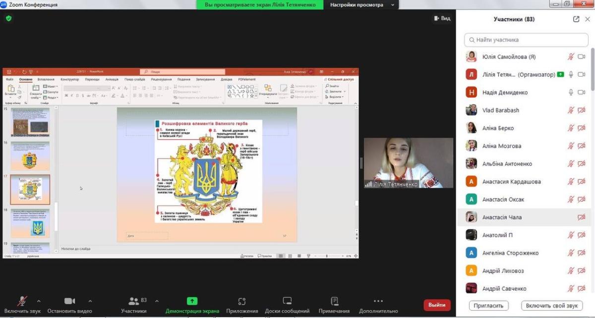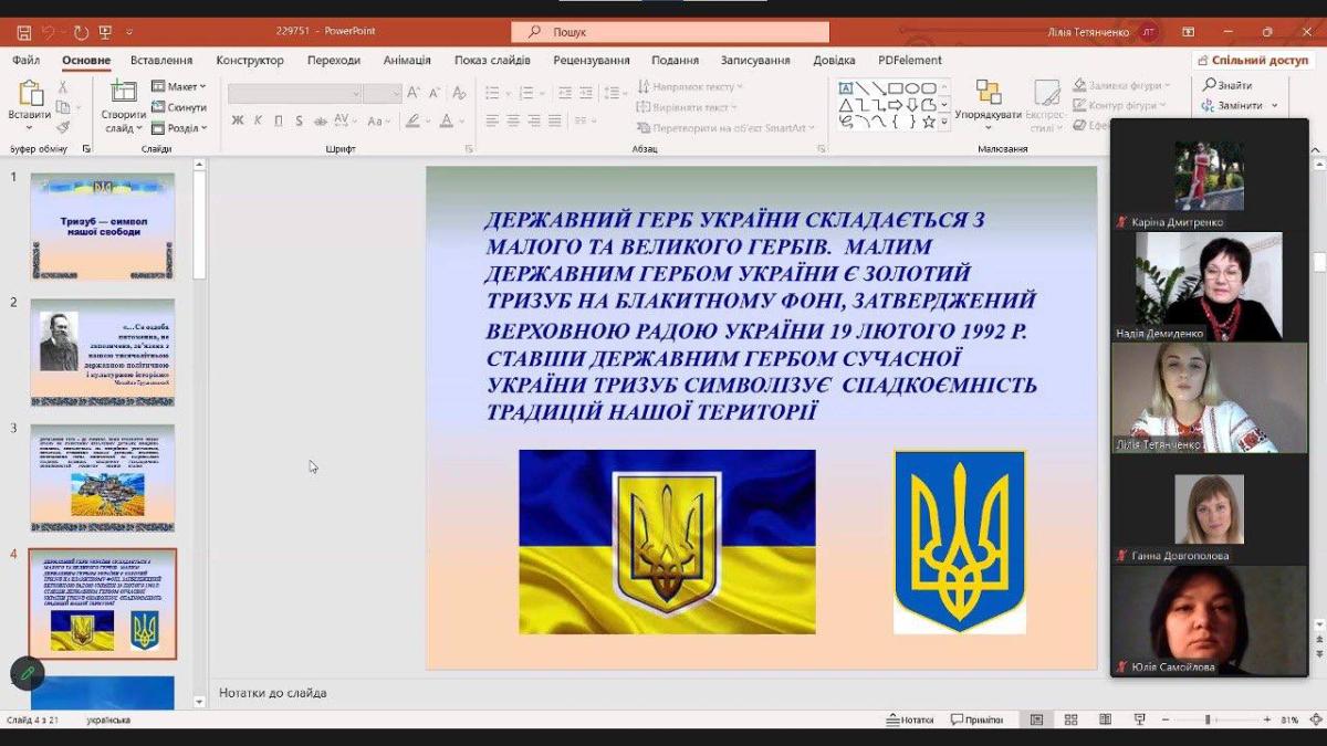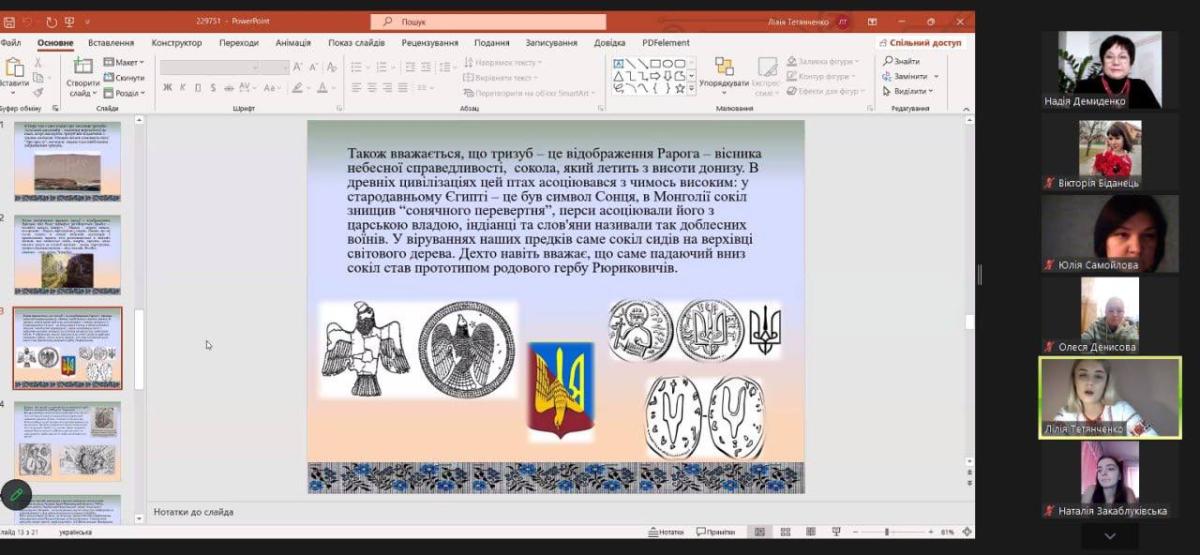 Учасники онлайн зустрічі мали можливість ще раз переконатись, що тризуб є стародавнім символом, який зустрічався на території сучасних українських земель із прадавніх часів і вважався магічним знаком, своєрідним оберегом. У вигляді державної символіки використовувався за часів Київської Русі. Наводились також приклади використання даного сакрального символу ще за існування древніх цивілізацій Індії, Єгипту тощо.